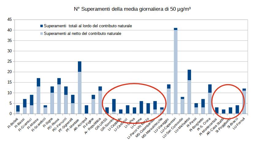 Con eccezione della stazione di fondo di LU-Capannori, presso la quale si sono verificati 40 eventi, al netto degli episodi di superamento per trasporto massivo di polveri da sorgenti naturali, in tutti gli altri siti gli eventi sono stati in numero molto contenuto, con massimo di 20 presso il sito PF di PT-Montale e pochi superamenti presso tutti i siti di traffico della regione.