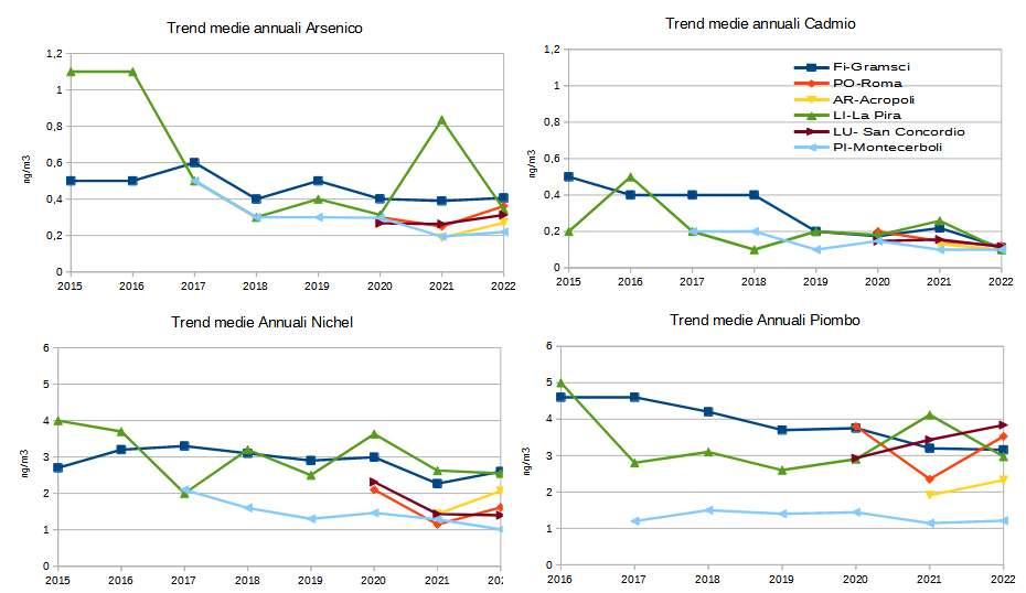 Metalli pesanti: il monitoraggio ha confermato l’assenza di criticità per As, Cd, Ni e Pb e il pieno rispetto dei valori obiettivo per arsenico, nichel e cadmio, oltre al rispetto del valore limite per il piombo, così come per gli anni passati