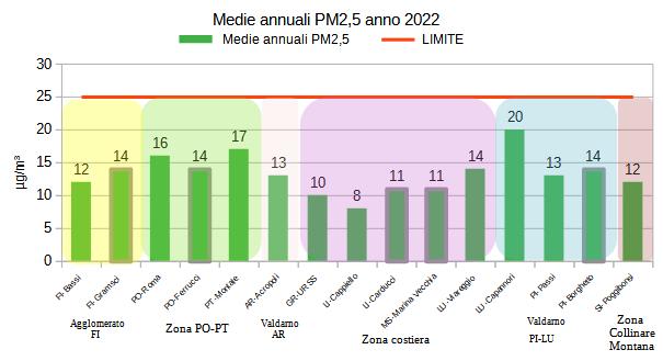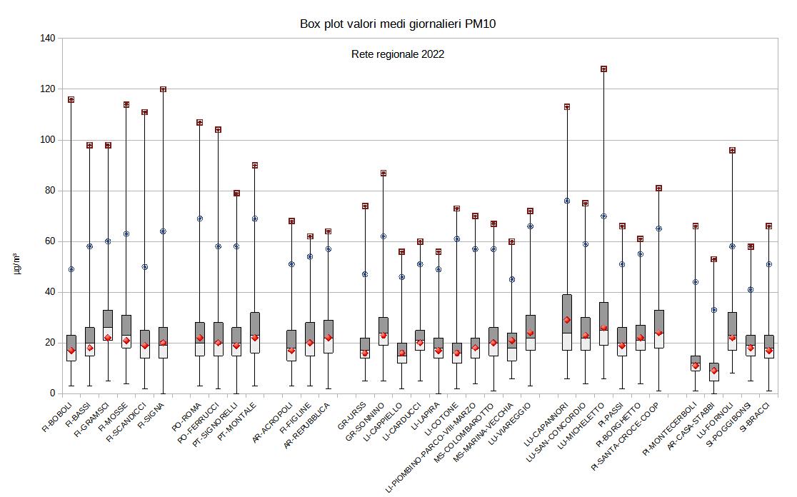 Anche nel 2022 la massima media annuale di PM10 è stata registrata presso la stazione di fondo del comune di Capannori, dove per il terzo anno consecutivo è stata pari a 29 µg/ m3 Tra le stazioni di traffico, le medie più elevate sono state registrate presso LUMicheletto e FI-Gramsci con 28 µg/m3 . La media complessiva regionale, sempre nel 2022, è stata pari a 22 µg/m3, con media delle stazioni di fondo pari a 21 µg/m3 e delle stazioni di traffico pari a 24µg/m3