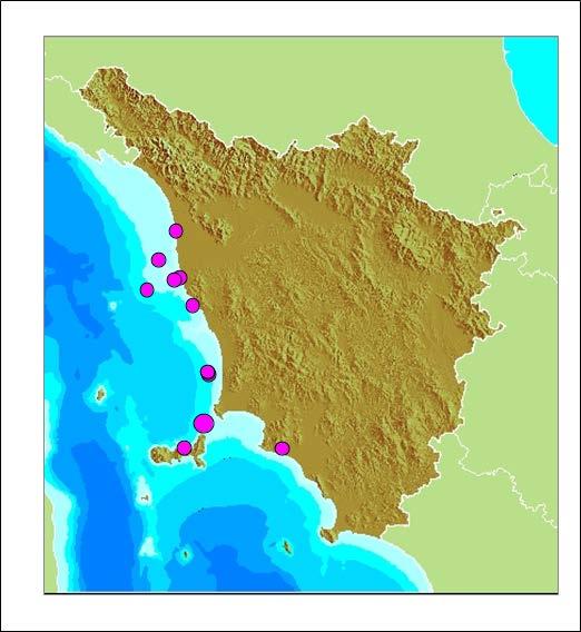 Per quanto riguarda le diverse specie, il 38% dei ritrovamenti è a carico della stenella e il 56% è rappresentato dal tursiope (Fig. 2.1). Il 70% circa degli spiaggiamenti si è concentrato nel periodo estivo (giugno-settembre) (Fig. 2.2), mentre il 44% degli spiaggiamenti si è registrato nella provincia di Livorno (Fig. 2.3); in totale sono stati interessati 11 comuni costieri della nostra regione (Tab. 2.2). La distribuzione geografica degli spiaggiamenti, totali e per specie, è riportata nelle figure 2.4 e 2.5.