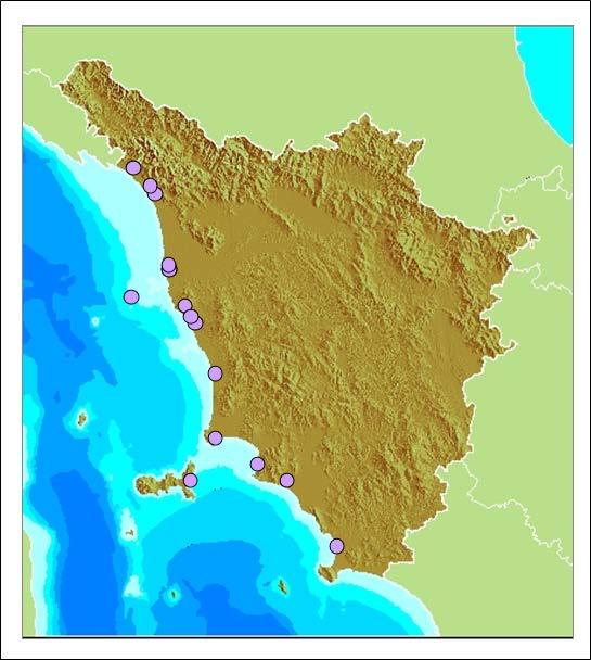 La figura 4.3 mostra la mappa della localizzazione geografica delle segnalazioni/catture di pesci cartilaginei in toscana per il 2022 e la figura 4.4 il dettaglio per ogni specie.