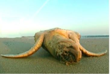Tartaruga mummificata (o resti dello scheletro); possibili organi interni esposti e perdita di materiale dal tratto gastrointestinale