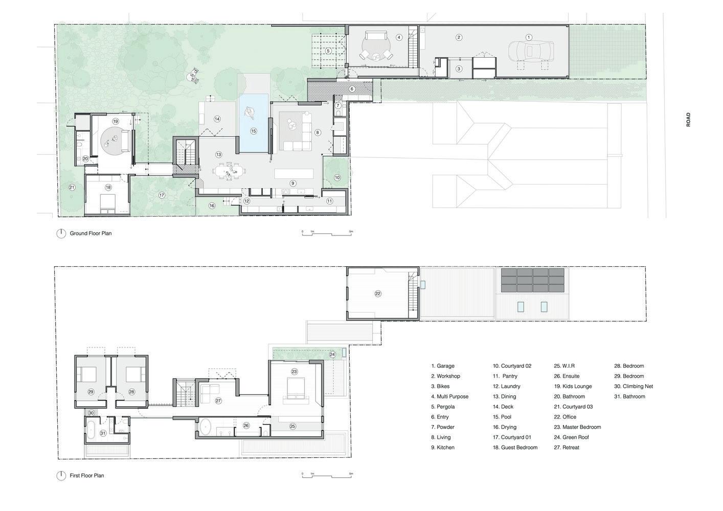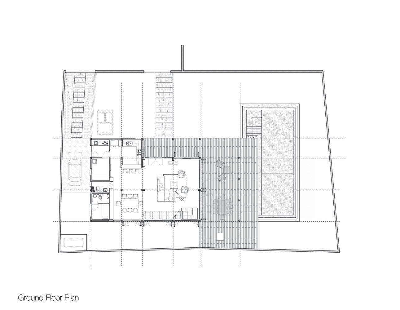 Được thiết kế cho một gia ình năm người với khả năng thường xuyên giải trí cho hàng chục người, ngôi nhà bao gồm bốn yếu tố riêng biệt xuất hiện dưới dạng các tòa nhà riêng biệt, 'vô hình' ược kết nối thông qua các hành lang kính ược nhân ôi phản chiếu khu vườn ược thiết lập tốt.