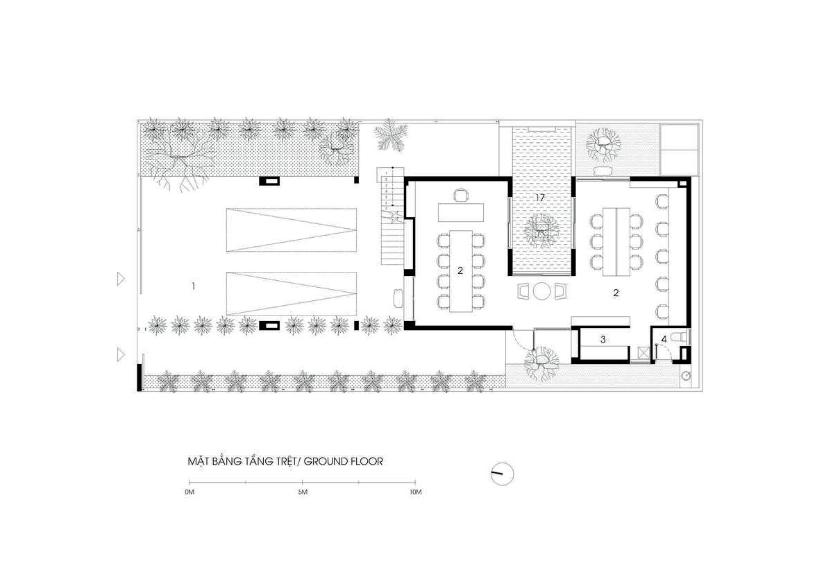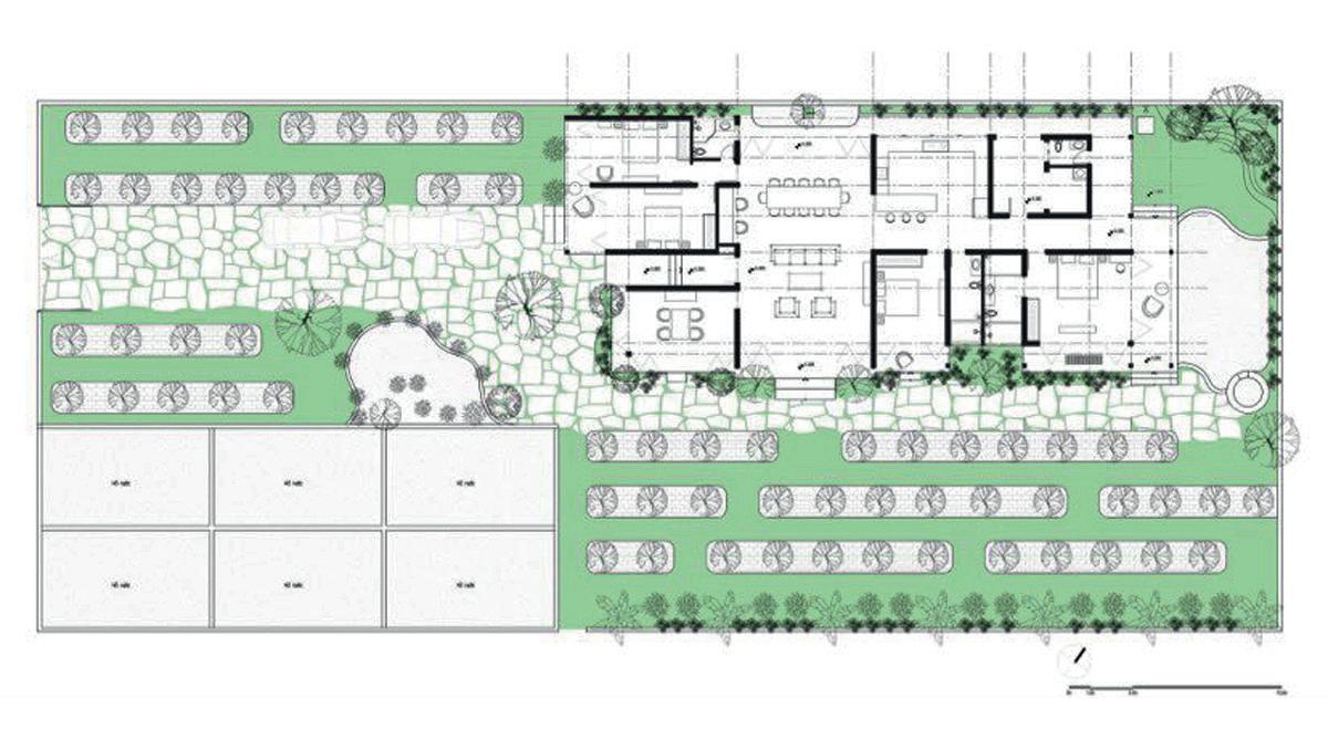 Mục tiêu của nhóm thiết kế là tạo ra không gian sống thư giãn và gần gũi với thiên nhiên nên công trình ược ặt ở phía cuối cạnh dài của khu ất ể tạo khoảng sân rộng phía trước với cây xanh, hồ cá.