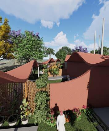 Segregated ritual zones with sitting area are surrounded by layers of greens. The cremation pyres are placed inside a cave like built form which has light terracotta finish. These elements are used in an attempt to generate a calming earthy aura.