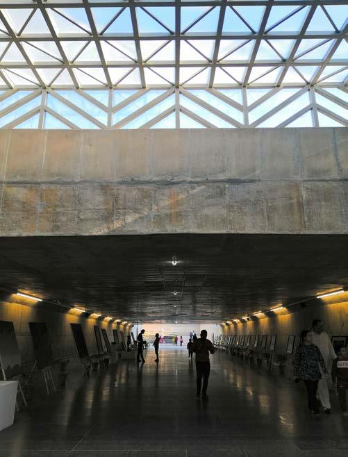 As the user exits the corridor they witness a staircase leading the eye to bright open sky. Gradually as they walk upwards, vast yamuna ghat reveals itself rendering geat openness and leaving people with a sense of epiphany