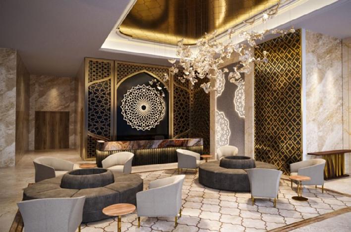 Both visitors who will be staying at the property and those who will be using the banquet are made to feel welcome at the concierge area.This section will showcase the idea. Accordingly, the floor features marble inlays with CNC designs and mother-of-pearl inlays.Additionally, PVD coatings are utilised everywhere.