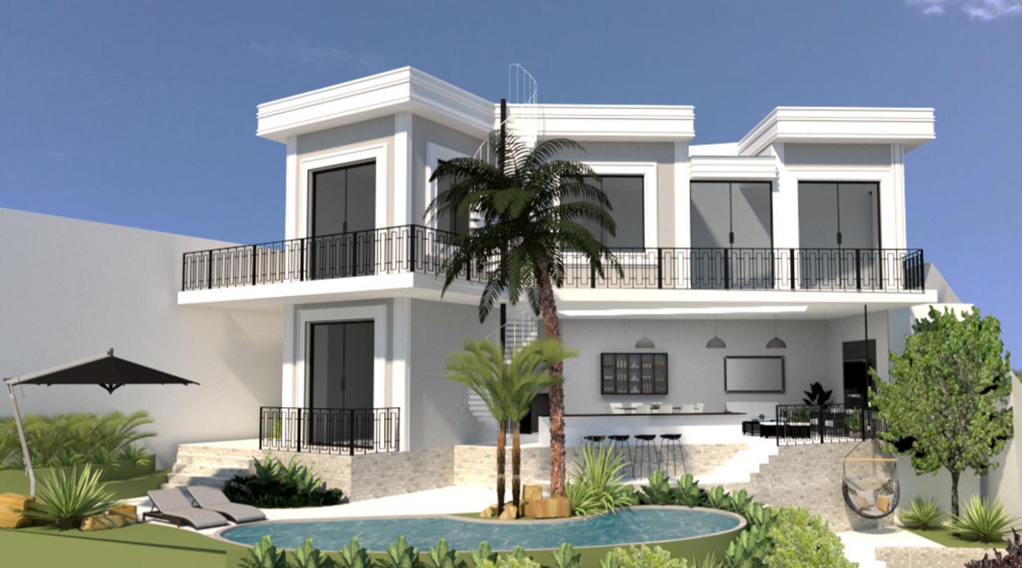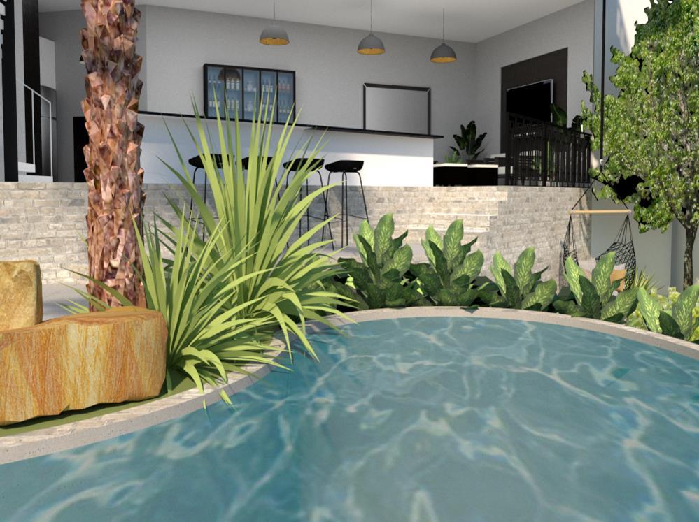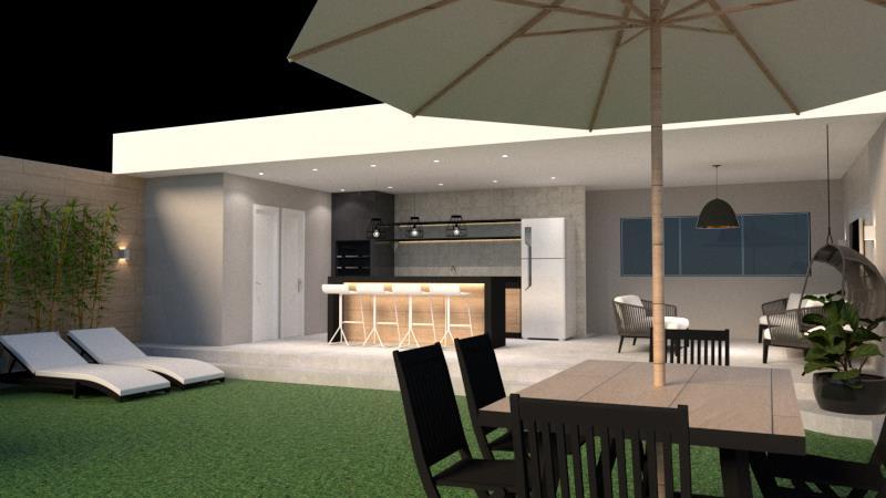 Imagens em 3D com vista da área de lazer, em projeto residencial idealizado pela arquiteta Marise Rodrigues, possibilitando visualização de volumetria, teste de incidência solar e aplicação de texturas