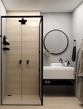 Composição: Porcelanato imitando madeira + tom claro.