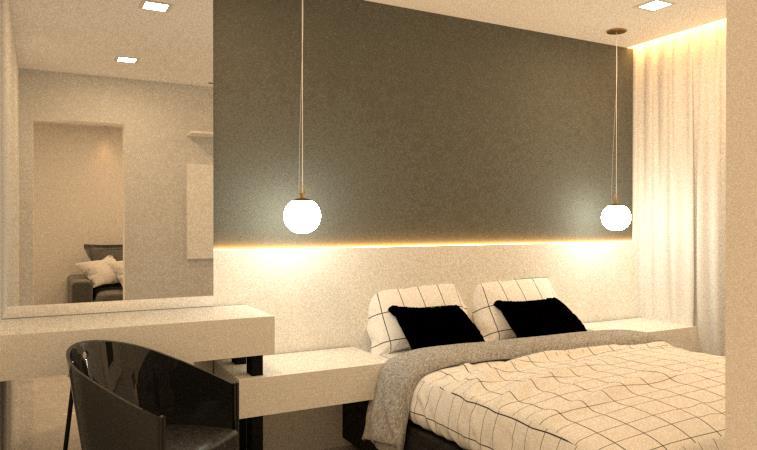 Para este quarto de casal fizemos o layout com a mobília existente e adicionamos luminárias, painel ripado, itens decorativos e uma cadeira para compor e agregar mais aconchego neste ambiente