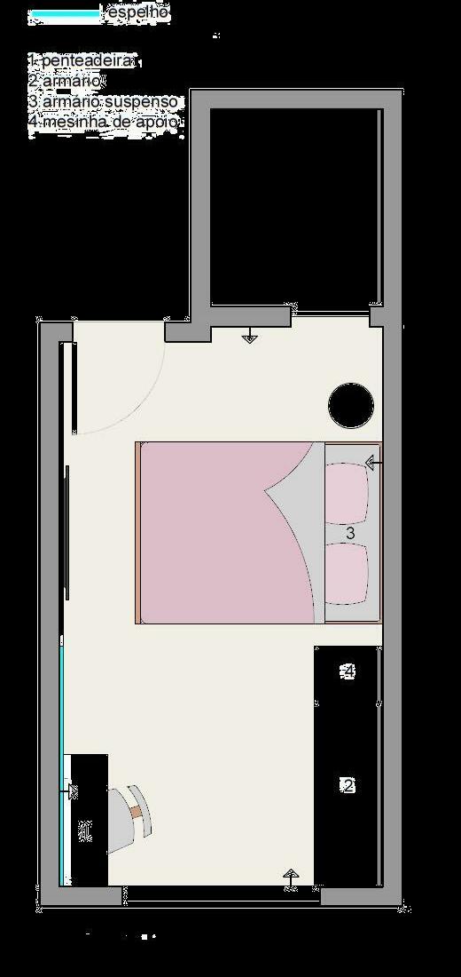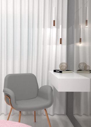 Optamos em deixar uma circulação mais ampla na área entre armário e penteadeira ganhando funcionalidade além de receber o foco da iluminação natural pela janela.