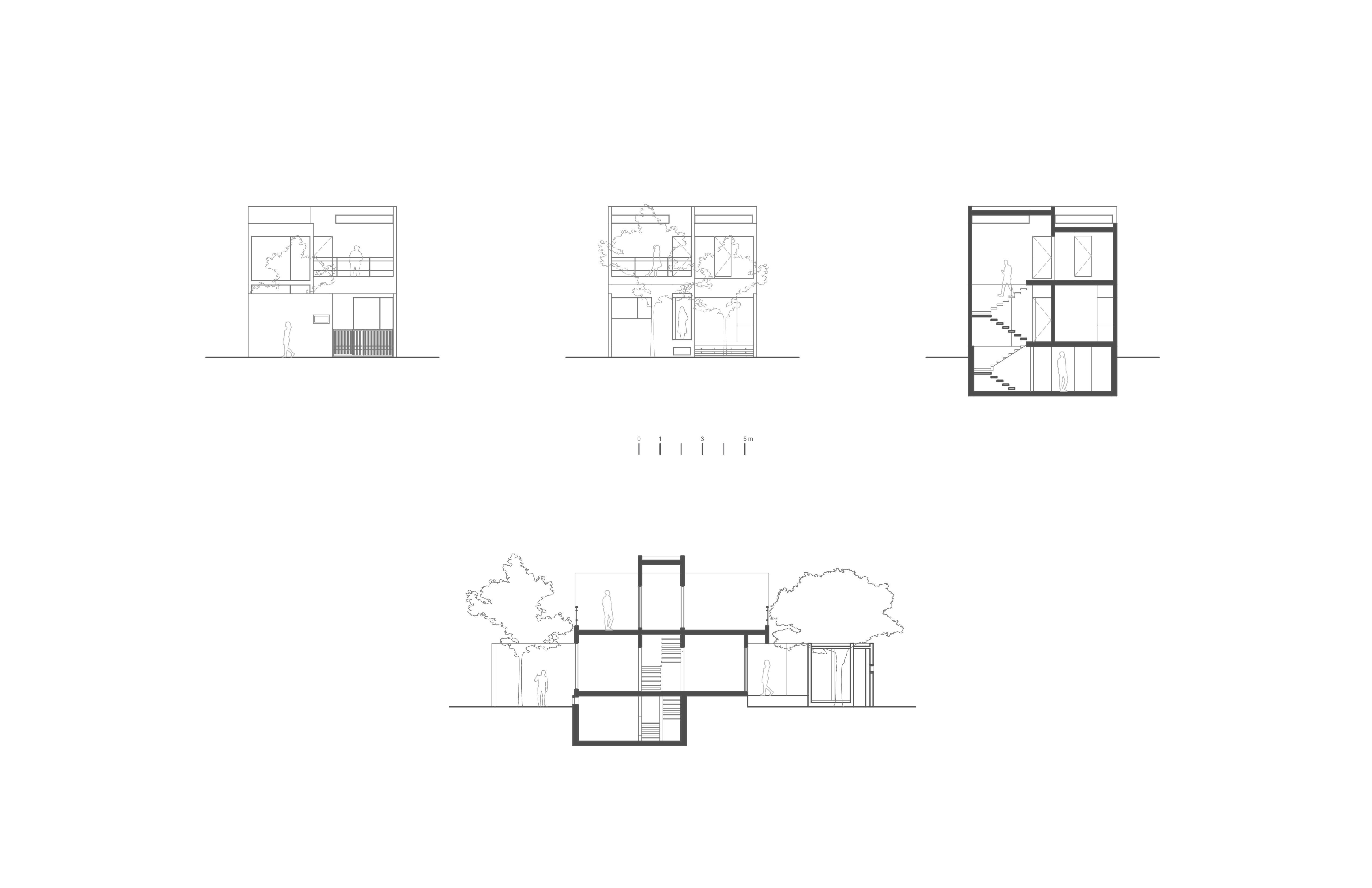El proyecto se desarrolla en un total de 3 niveles: la planta baja se destina al área social y de servicios, la planta alta para uso habitacional y el caso especial del consultorio; además, existirá un sótano con un lavado y una zona de entretenimiento.