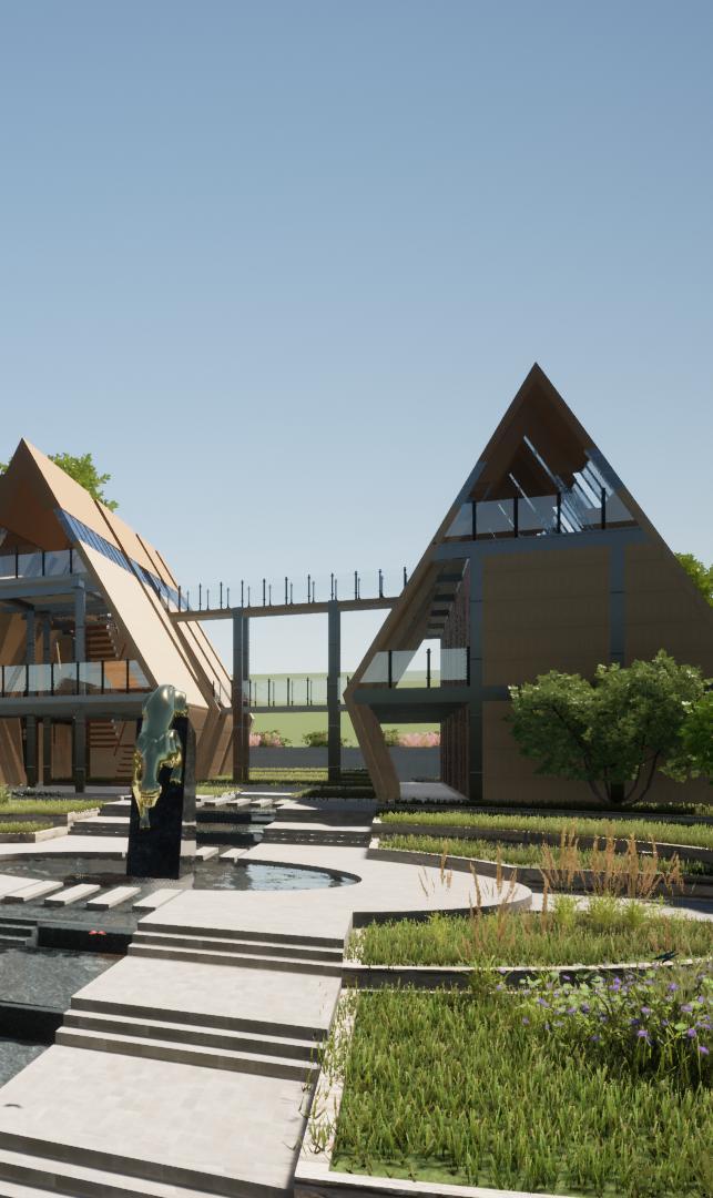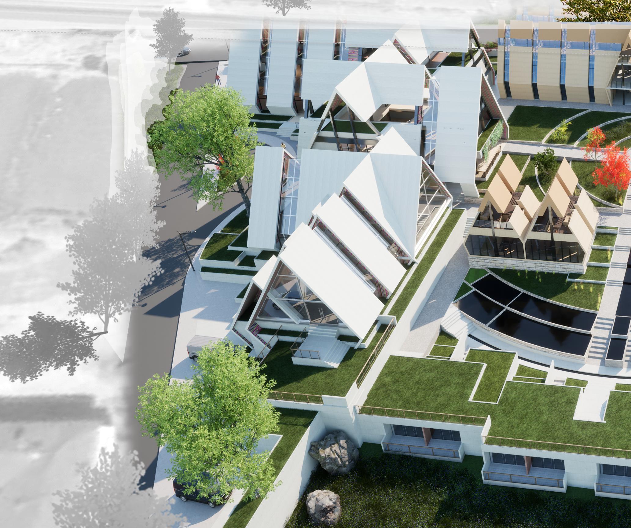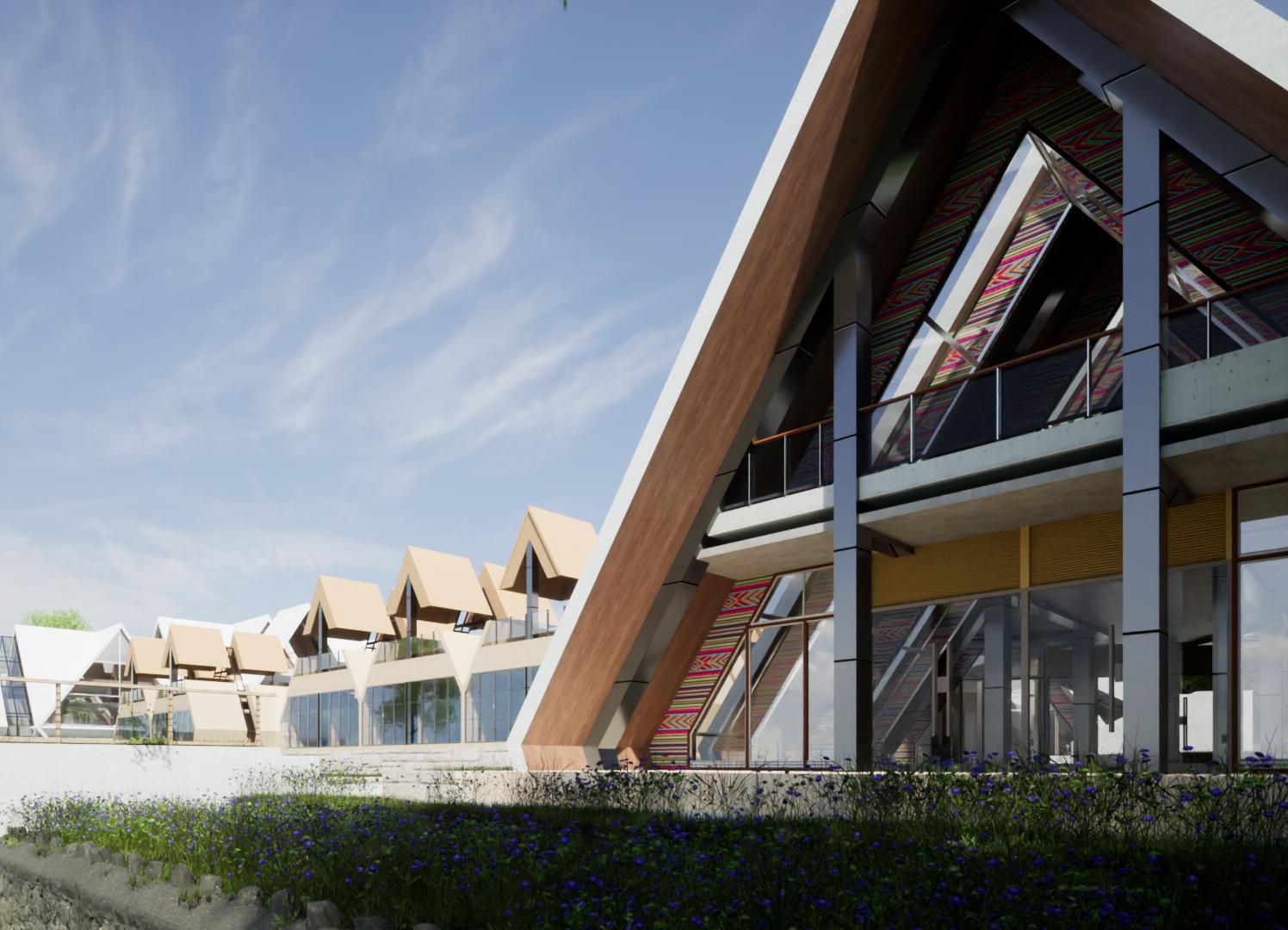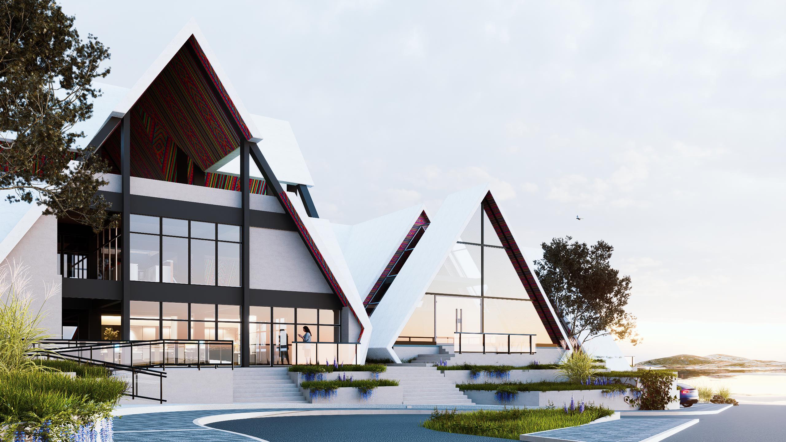El componente formal más destacable en este proyecto es la proyección de techos a dos aguas que se sub dividen en simétricas y asimétricas, son el componente fundamental en la conceptualización y funcionabilidad del módulo inspirado de la vivienda o kancha inca, la cubierta consta con ángulos de 5565 grados de inclinación, lo cual genera una altura promedio de 12 metros