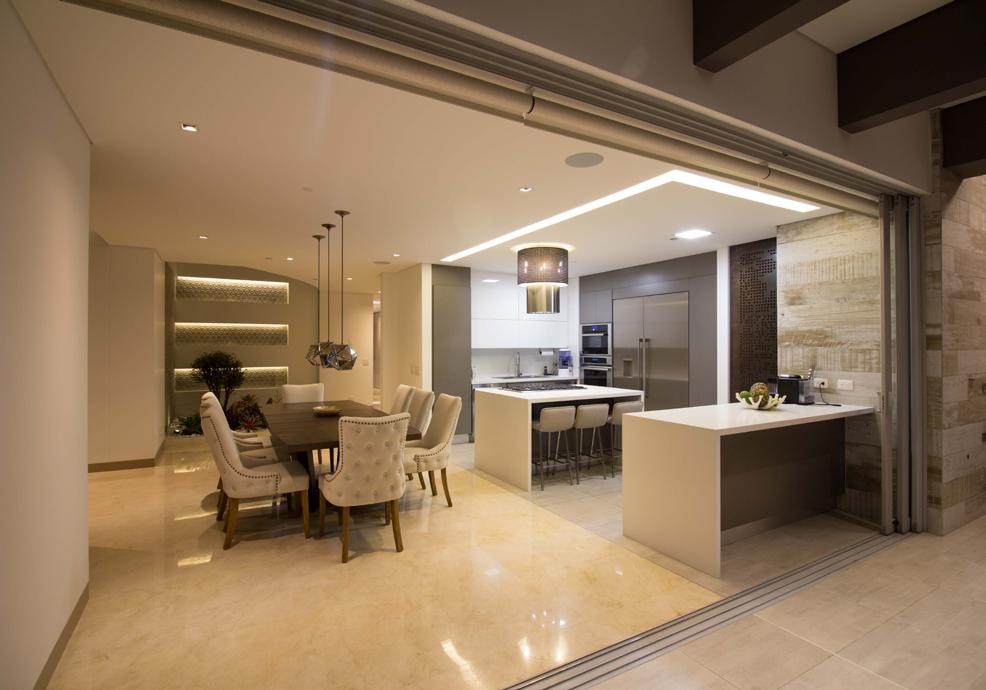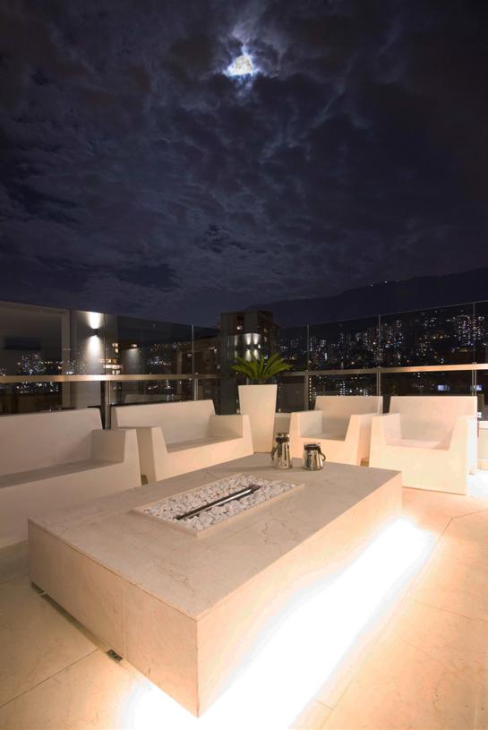 En este proyecto de remodelación el reto de diseño consistió en darle un ambiente de casa campestre a un pent-house dúplex, el deseo del cliente era tener zonas verdes reales alrededor de las alcobas, para lograrlo se ubicaron las alcobas en el segundo piso, se diseñaron las alcobas de forma que quedaran rodeadas de terrazas y estas terrazas se convirtieron en zona verde, esto se logró coordinando los requisitos técnicos necesarios para tener grama real y el concepto arquitectónico de estar rodeado de naturaleza..