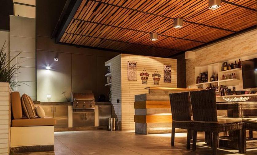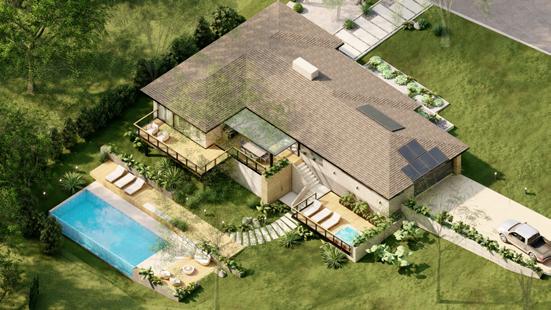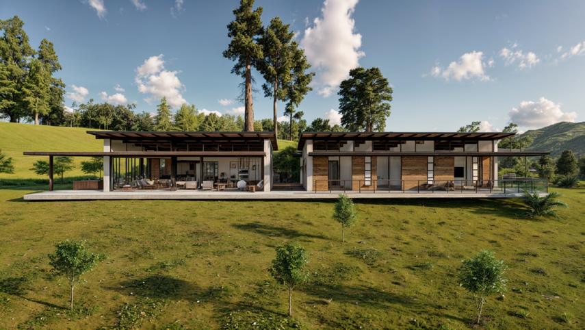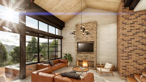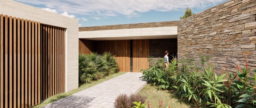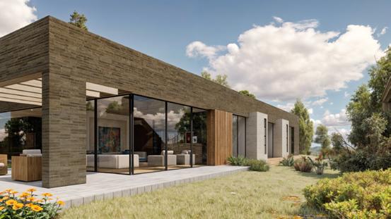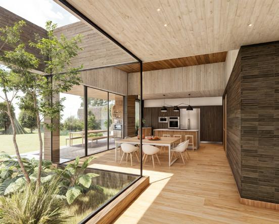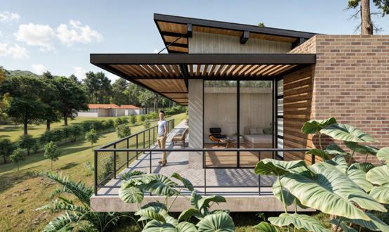 Este diseño destaca por el uso de materiales expuestos que realzan su carácter atemporal y conexión con el entorno natural. La estructura combina ladrillos a la vista, madera natural y amplios ventanales de vidrio que permiten integrar los espacios interiores con el paisaje exterior. El área social abierta, complementada por terrazas, refuerza la relación directa con la naturaleza circundante, creando un equilibrio entre modernidad y calidez rústica.