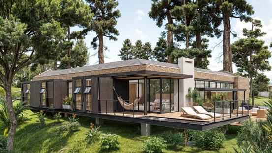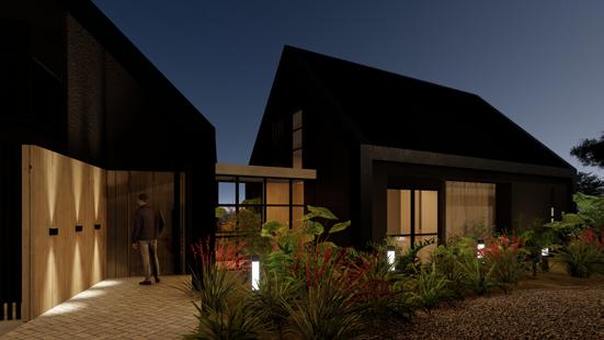 The house consists of two gableroof volumes: an open social module with a double-height glazed façade and a more enclosed private module for bedrooms. The combination of dark finishes, wood, and glass enhances its contemporary style and connection to the landscape, taking advantage of the slope to frame the views.