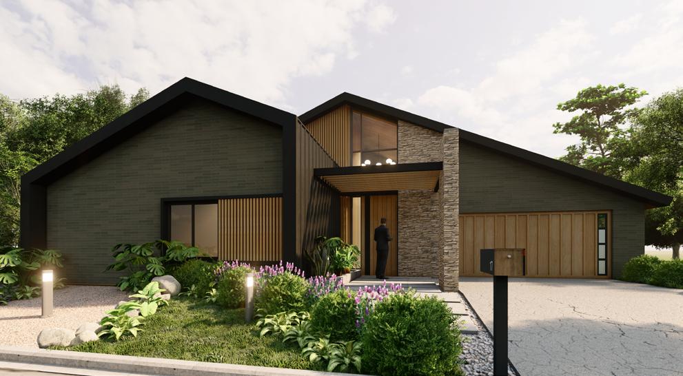 The design challenge was to remodel the exterior of an old ranch and transform it into a contemporary facade in order to increase the value of the property and give it the look of a contemporary barn-style house. Industrial materials were used, and the landscaping of the front garden was also improved.