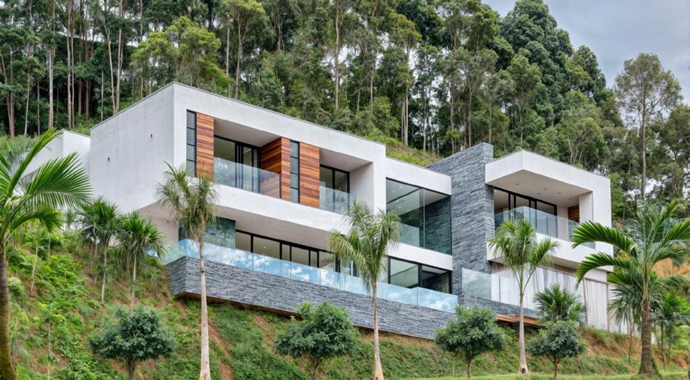 House located in an urban subdivision in Medellín, designed in a minimalist style where white is the dominant color, providing a sense of spaciousness and brightness. Contrasts with natural wood and stone veneer details add warmth and an organic touch, creating a balance between elegance and connection with the surroundings.