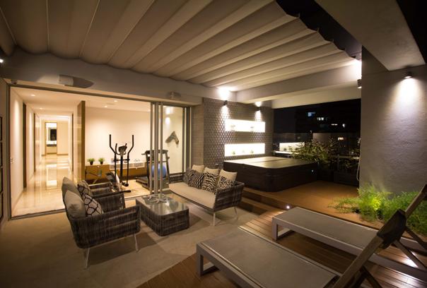 En este proyecto se cambió la distribución arquitectónica del apartamento original y se desarrollo todo el diseño de interiores, el concepto era tener espacios tranquilos con colores neutros, áreas abiertas e integradas. El espacio mas importante era la terraza, que por su amplitud cuenta con espacio de BBQ , zonas de estancia, bar y bañera de hidromasajes.