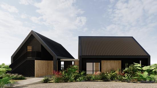 La vivienda se compone de dos volúmenes con cubierta a dos aguas: un módulo social abierto con fachada acristalada de doble altura y un módulo privado de habitaciones más cerrado. La combinación de acabados oscuros, madera y vidrio refuerza su estilo contemporáneo y la integración con el paisaje, aprovechando la pendiente para enmarcar las vistas.