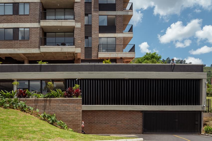 El diseño del proyecto estuvo condicionado por un desnivel muy grande en su terreno, aproximadamente 25 metros, se ubicó el punto de ingreso por la vía más alta y los pisos de parqueaderos se desarrollaron en los niveles negativos al ingreso, la plataforma de parqueo se diseñó como una estructura levantada del terreno, esto se logró gracias al diseño estructural de pantallas de concreto inclinadas y grandes voladizos.