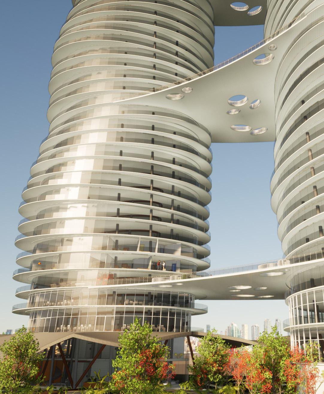 La propuesta nace del concepto de ¨turning torso¨. Compuesto por losas giratorias que cada 2 niveles giran en un angulo de 12 grados hasta llegar a los 48 grados. Los apartamentos en ambas torres ofrecen vistas panorámicas del horizonte de la ciudad desde balcones.