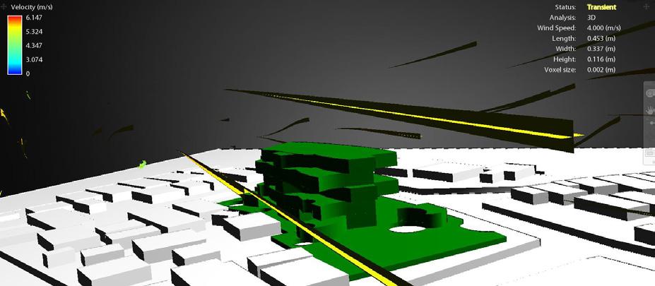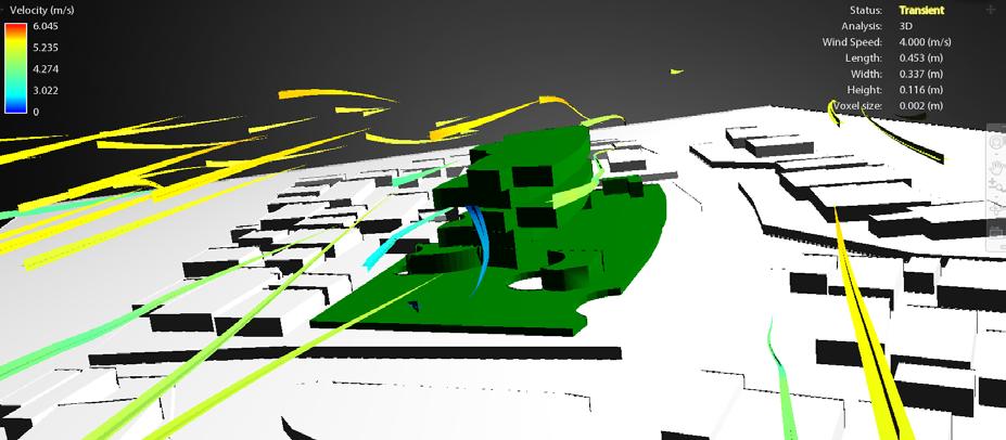 Comentarios: Del análisis de viento en 3D es posible observar como el viento pasa en el interior del proyecto y con una velocidad fuertemente reducida permitiendo así un confort en estos espacios y al igual que dentro de las viviendas. Del mismo modo, la piel arquitectónica permitirá reducir la velocidad de las fuertes ventiscas.