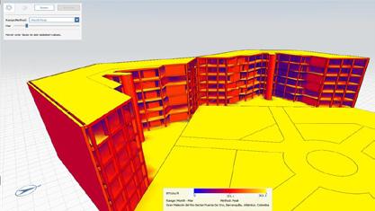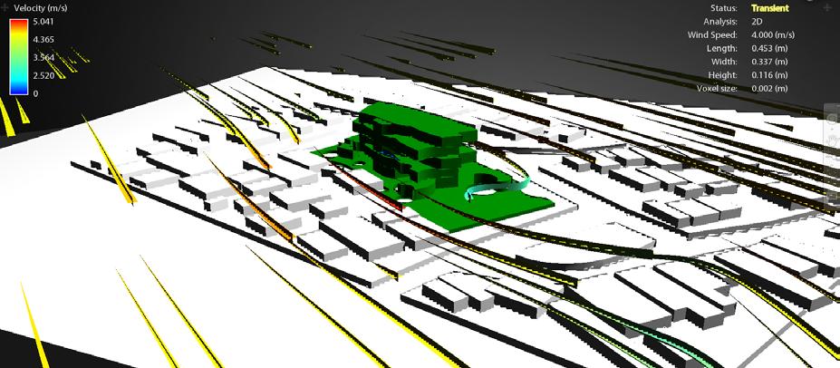 Comentarios: Del análisis de viento en 2D es posible observar el cómo los vientos predominantes vienen desde el noreste y al no haber elementos que obstaculicen el viento, estos impactan a altas velocidades en las edificaciones, pero gracias a la piel este impacto sobre la edificación se ve fuertemente reducido.