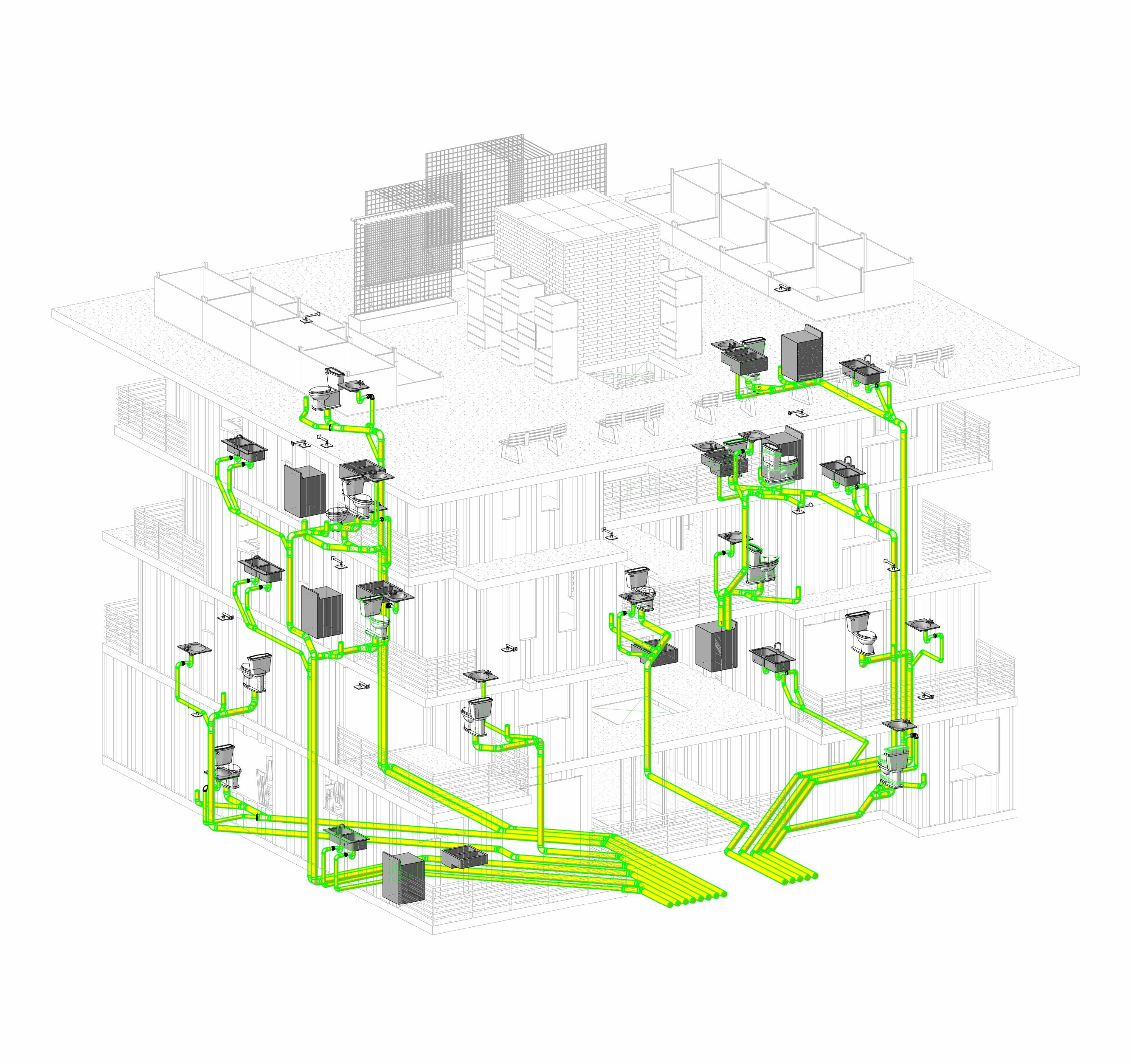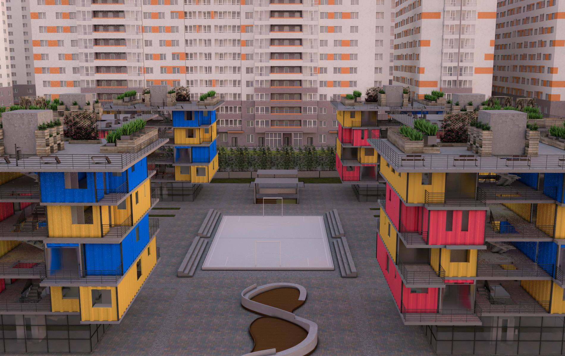Diseño de propuesta de torre de aptos, 4 pisos, usando como materia prima principal contenedores maritimos aprovechando su autoportabilidad y compatibilidad con elementos estructurales metalicos.