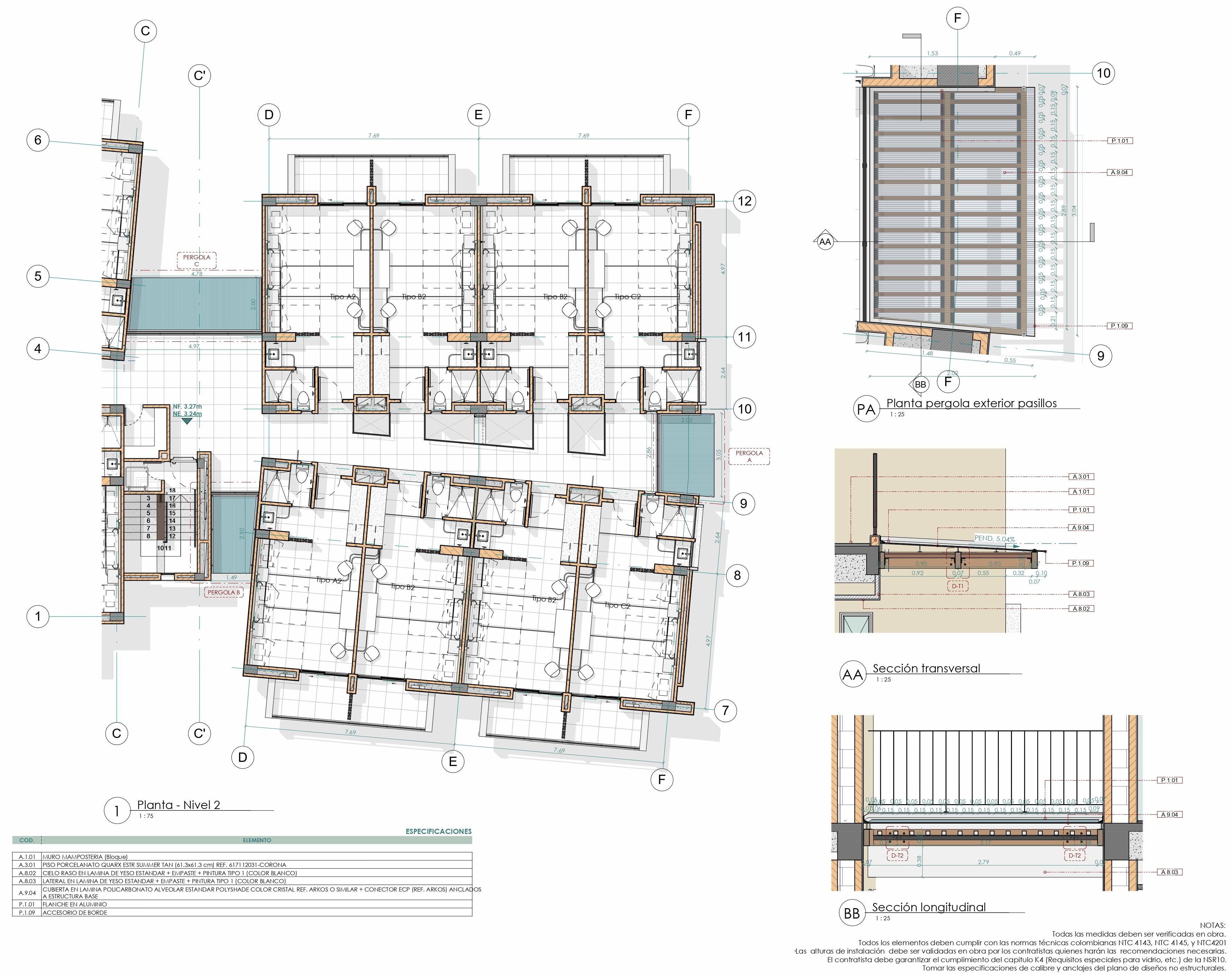 Realización de planos de obra y detalles para construccion de pergola y cubierta en hotel ubicado en Villeta, Cundinamarca.