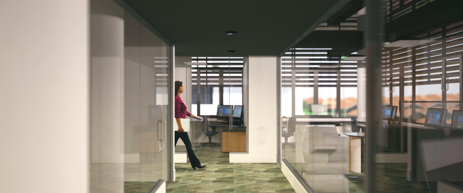 Se consideró el uso de louvers instalados en las fachadas del edificio para filtrar la luz del sol, sin limitar la visibilidad hacia el exterior. Y los espacios internos de las oficinas contarán con muros cortina para brindar esa sensación de amplitud en las distintas sub divisiones