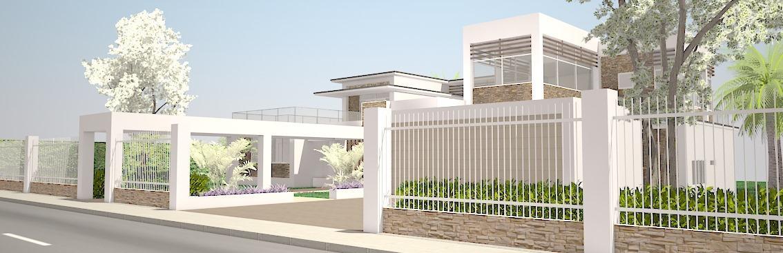 Esta residencia presenta un diseño más elaborado, sin abandonar el estilo minimalista y elegante, reflejado en sus blancas fachadas asimétricas, divididas en dos (2) niveles que se definen por los prominentes aleros alargados que cumplen la función de dar sombra mientras brindan una perspectiva de asentamiento general al edificio, gracias a la horizontalidad de las losas que se reflejan en la fachada posterior, promoviendo igualmente una sensación de ingravidez.