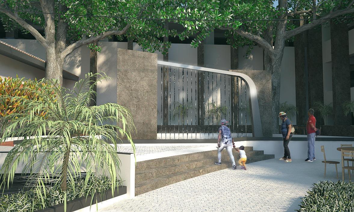 Igualmente se propuso el espacio para un espejo y fuente de agua, que pueden ser apreciados desde una terraza techada y utilizada por el restaurante, en donde se ubicarán sillas y mesas.