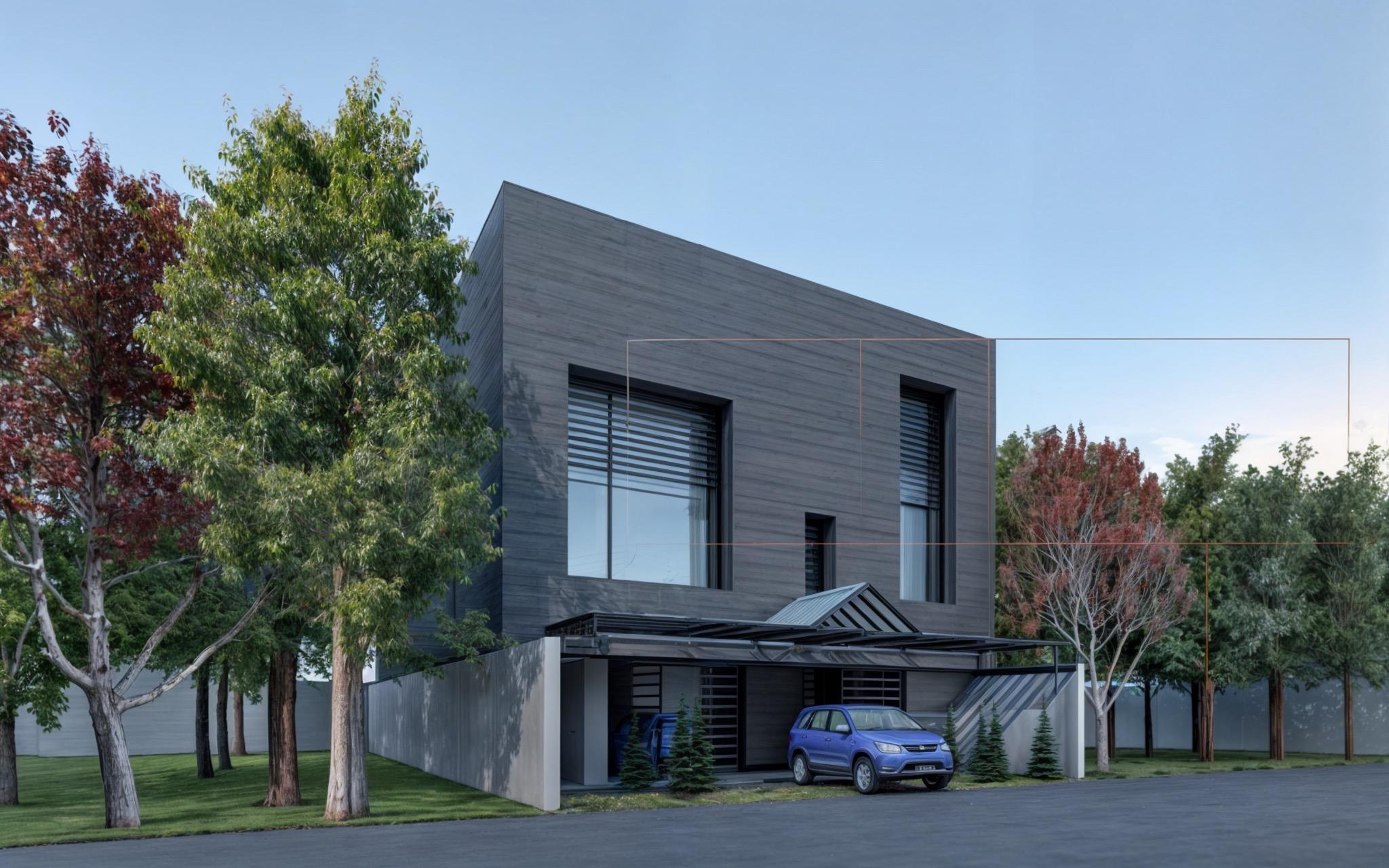 UN VOLUMEN SIMPLE CON LOS BUKES DE LAS VENTANAS EXPRESIVAS CON UNA ENTRADA DE UNA PÉRGOLA DE VIDRIO AL FRENTE DE LA PROPIEDAD.