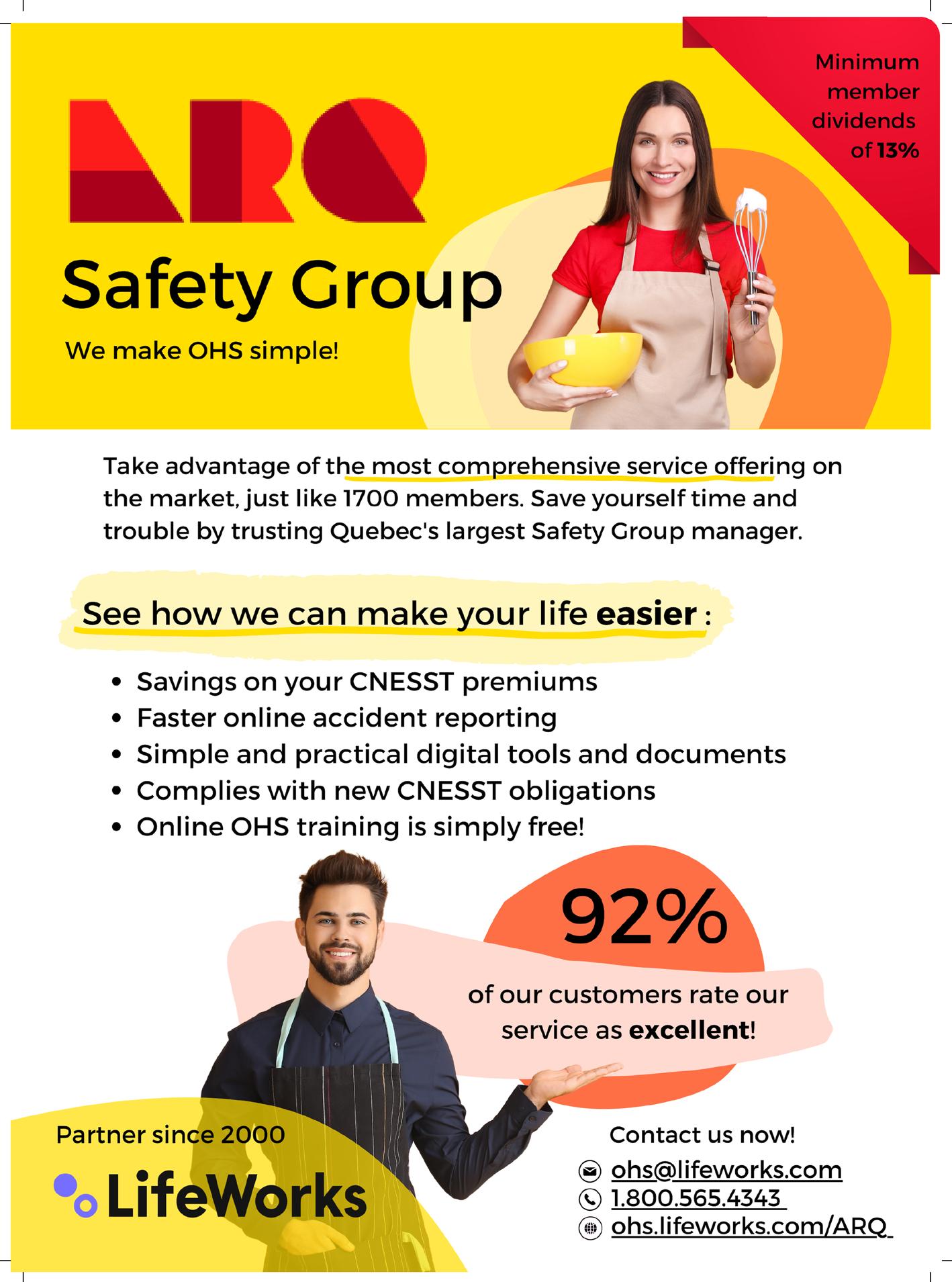 ARQ Info is published six times a year by the public affairs department of Association Restauration Québec. The articles may be reproduced without permission, provided that the source is mentioned. This issue was published in 10,000 copies.
