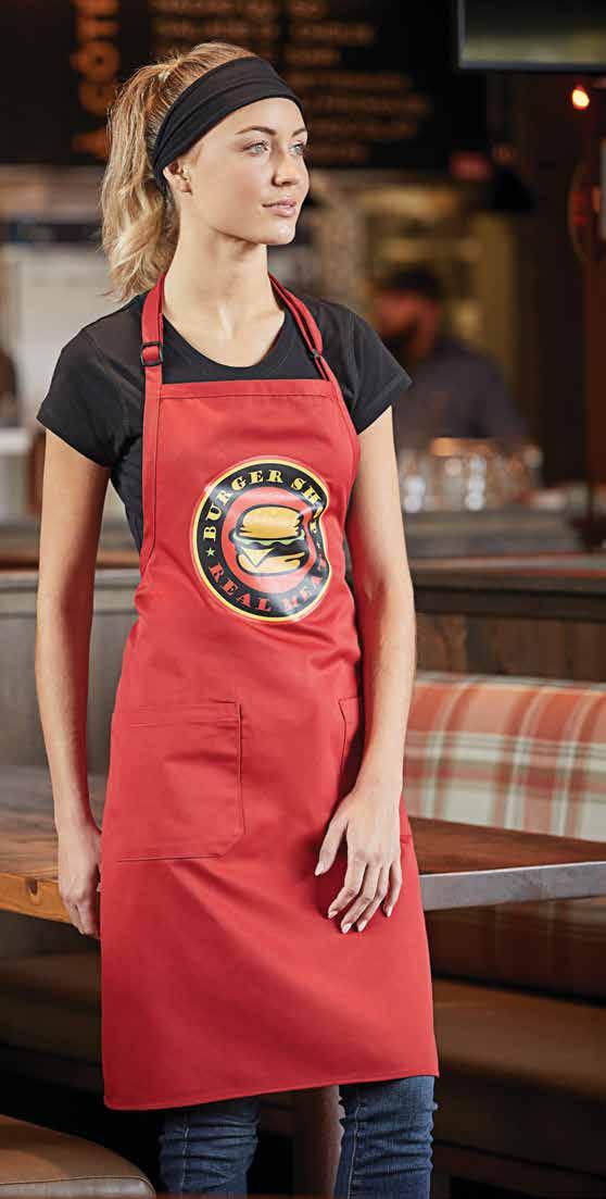Ajustable au cou, bavette plus large, avec petite poche cellulaire et grande poche deux sections avec espace à crayons, longueur du tablier 32 pouces, 65 % polyester, 35 % coton, lavable, facile d’entretien. Gris métallique. (19820)