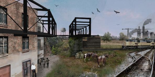 Mediante Illustrator se realizó una perspectiva a modo de ilustración. Además de la creación de planos a puntos de fuga, se les aplicó un texturizado con distorción de envolvente y ambientación.