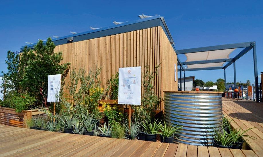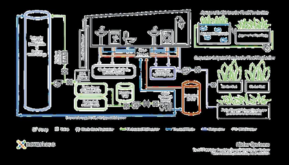 Se utilizan aguas grises para la lavadora, el fregadero y la ducha, mientrasqueunsistemaacuapónico ayuda a irrigar las plantas alimenticias.