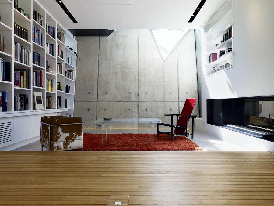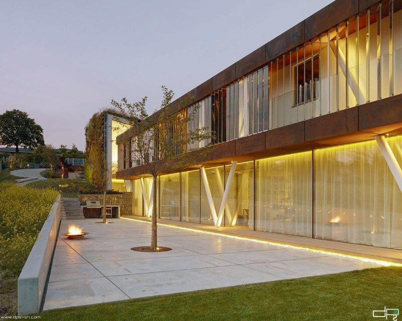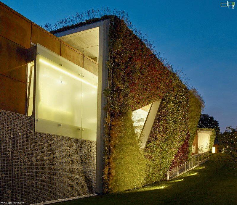 Ha pedido del cliente se quiso aprovechar las vistas tanto al sur como al oeste. Para hacer frente a la topografía de los sitios, se decidió que la residencia tomaría una forma similar y se dividiría en dos niveles, además de la forma rectangular primaria, una carcasa exterior sobresale hacia afuera y hacia arriba, funcionando como una pared verde.