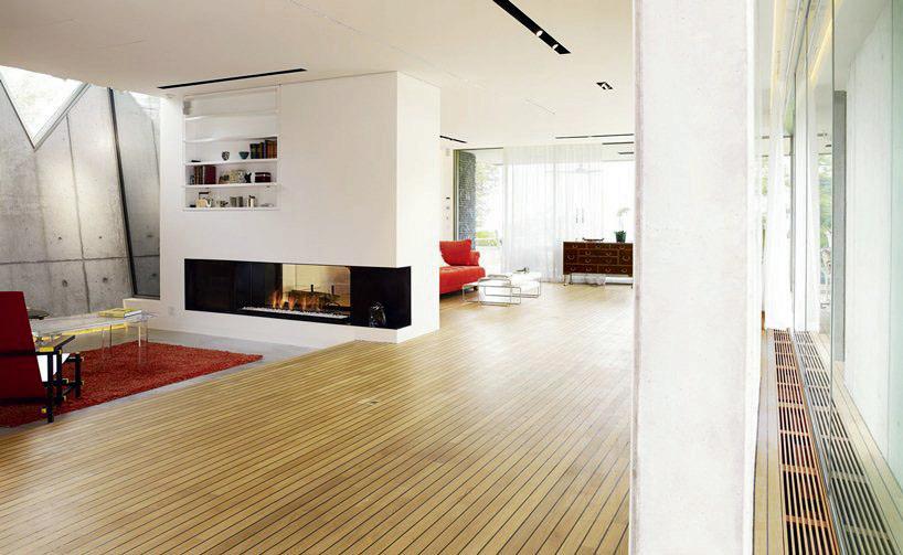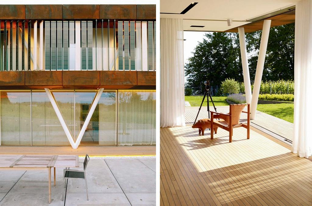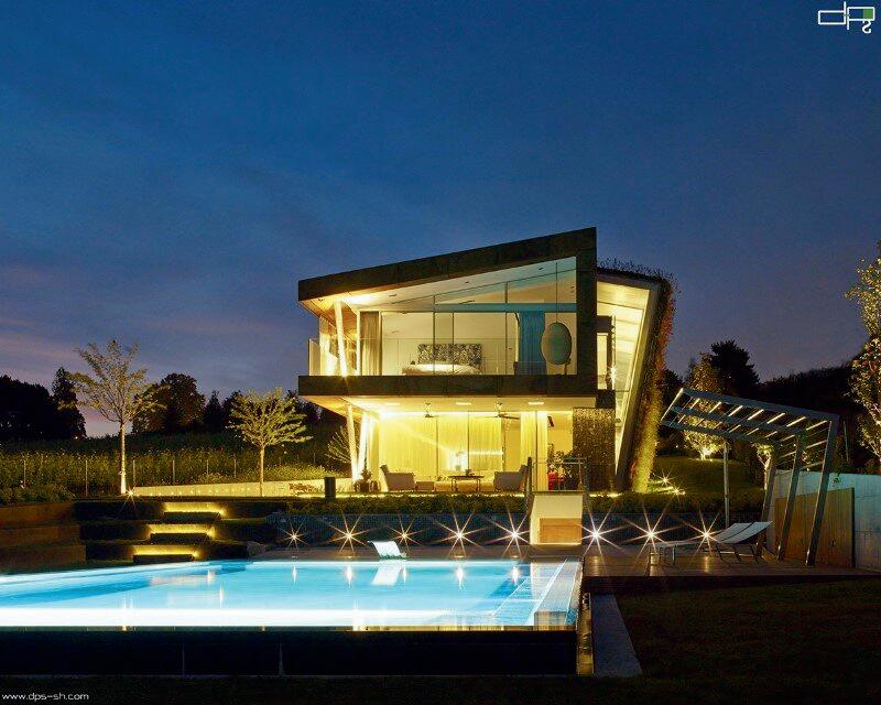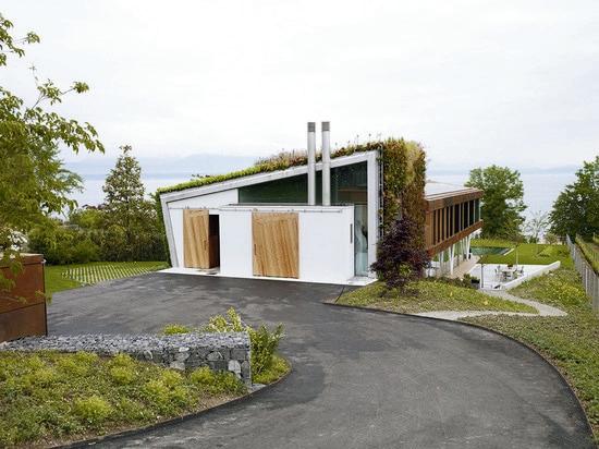 Es una casa energéticamente eficiente con techo verde que se encuentra en una parcela largayestrechaconvistaalas orillasdeunodeloslagosmás grandesdeLausana.