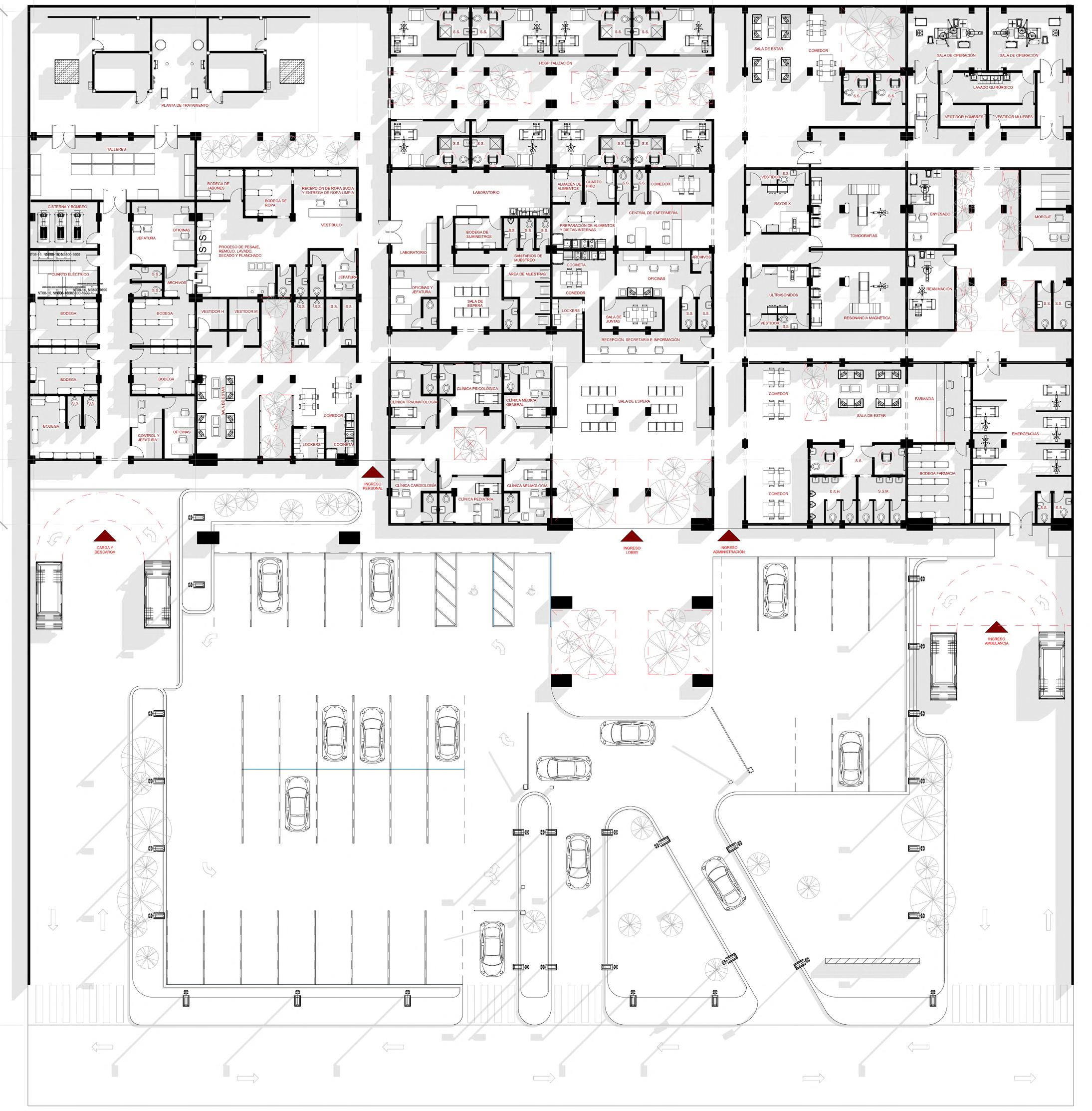 período no superior a 3 días. El estilo arquitectónico de este proyecto se caracteriza por su simplicidad, empleando fachadas de hormigón y ladrillo en consonancia con la arquitectura local de Jalapa. Se destaca la funcionalidad del espacio, diseñado para facilitar el traslado de pacientes a lo largo de recorridos específicos. Los pasillos, largos y anchos, conducen hasta jardines interiores que añaden un toque relajante a la hospitalización, enfatizando así la importancia de la experiencia visual y ambiental en el diseño del hospital.