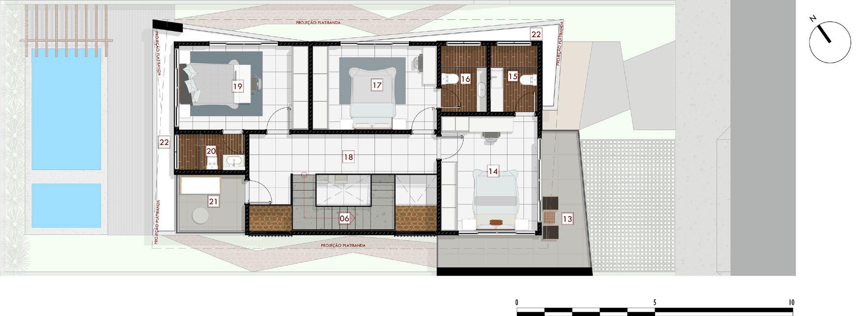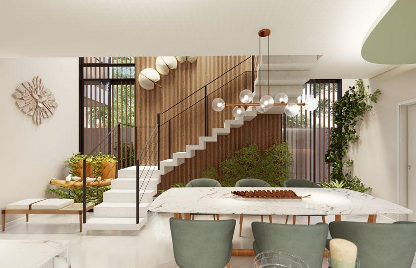 Outro importante referencial utilizado foi da biofilia, quando buscamos um maior contato com elementos naturais, seja na decoração dos ambientes ou nas visadas para áreas externas com vegetação e cascata.