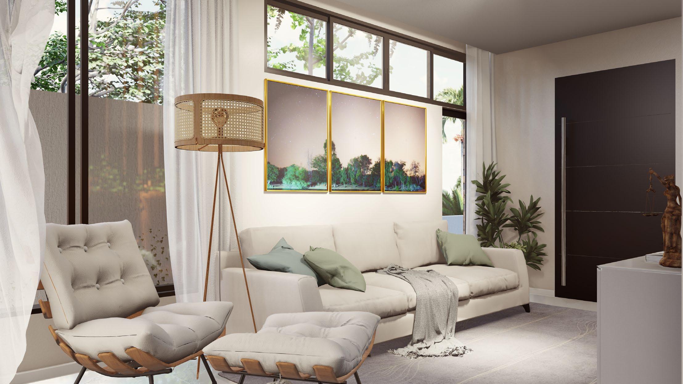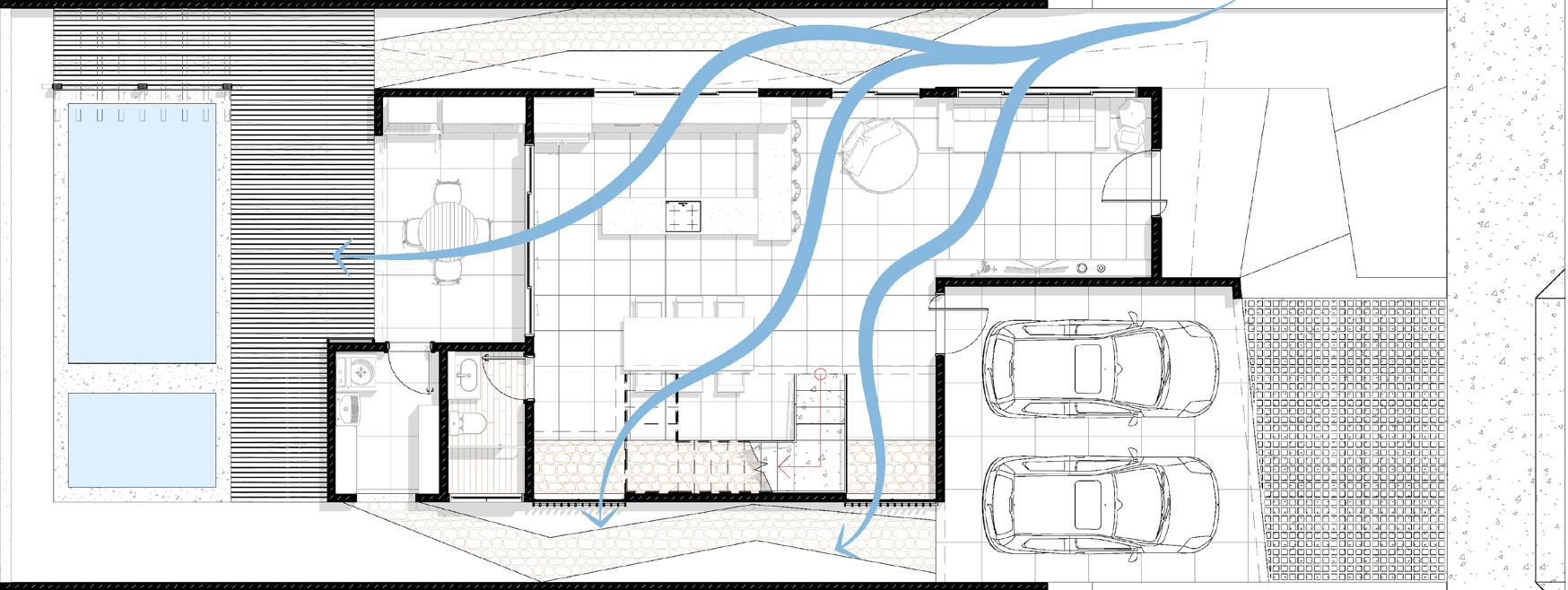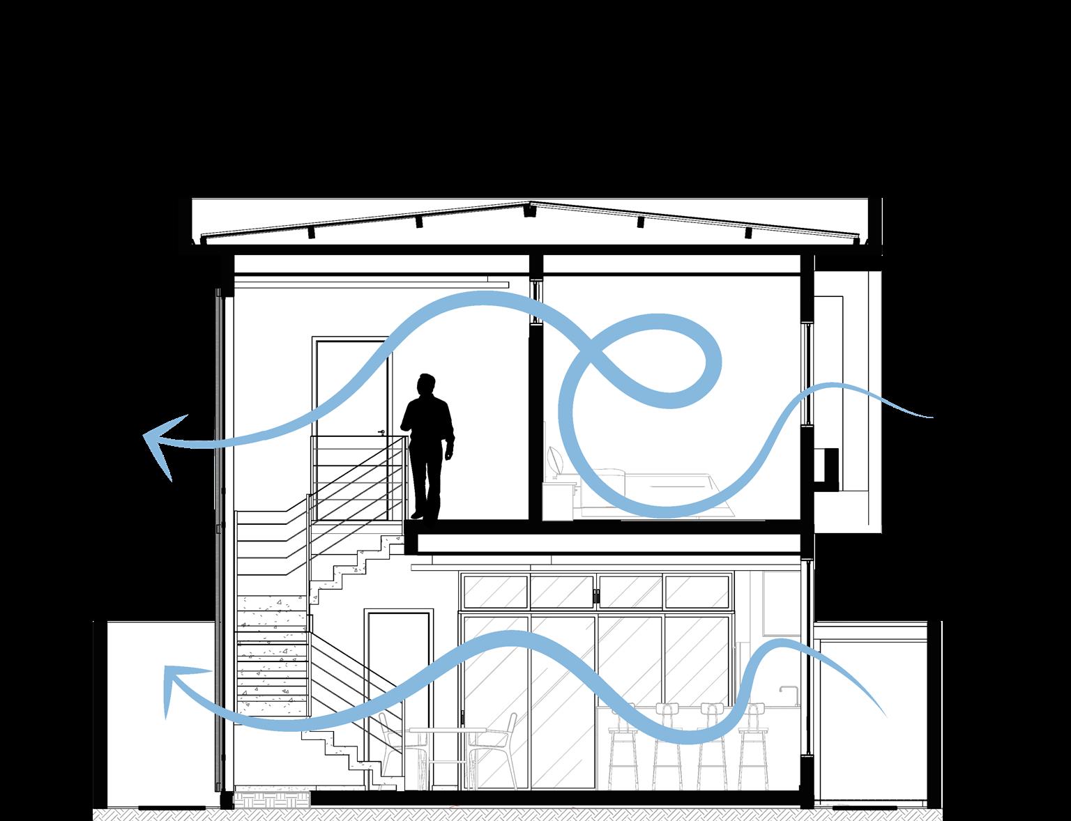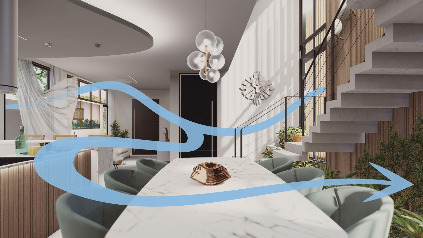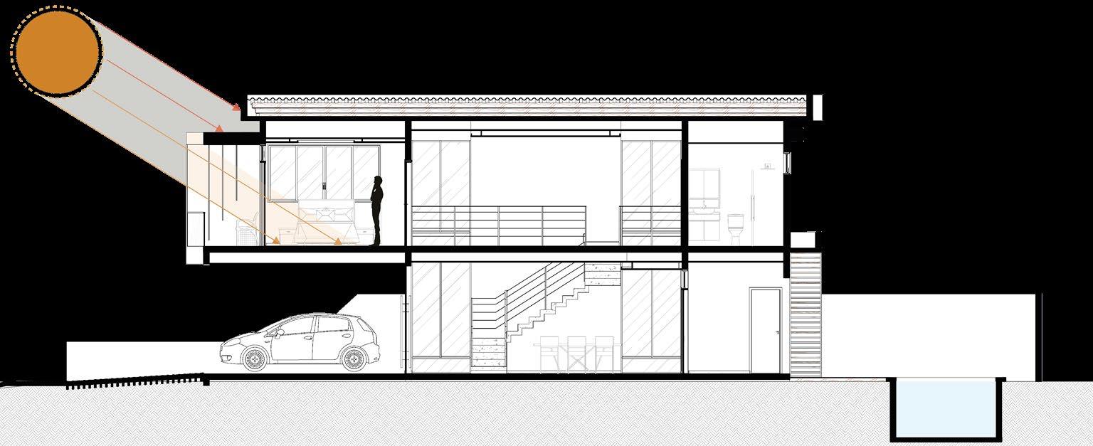 Projetamos os ambientes principais, como salas e quartos, para que a luz do sol entre e realize seu efeito bactericida, As janelas são posicionadas para permitir o cruzamento da ventilação natural, trazendo mais conforto térmico aos ambientes.