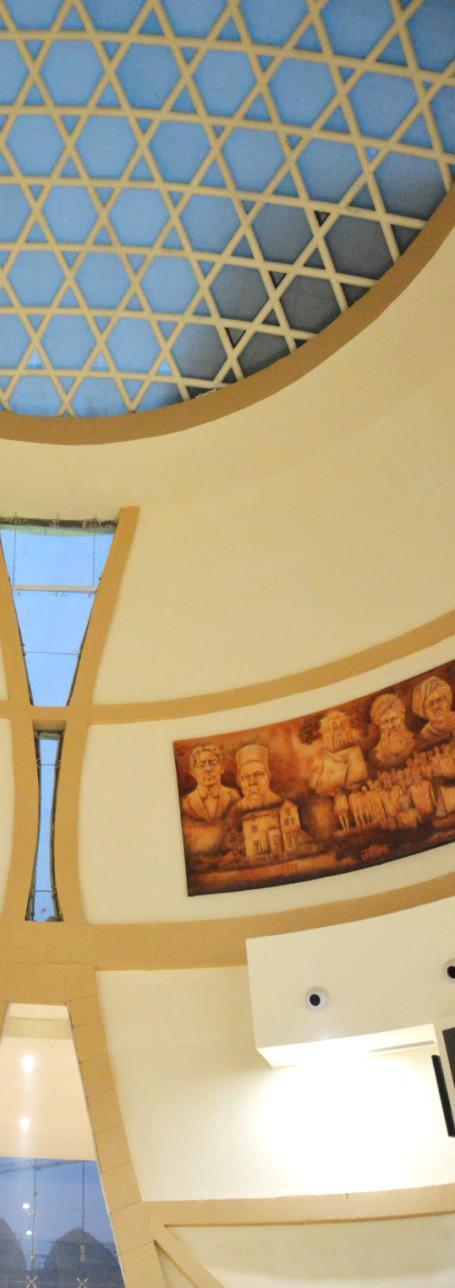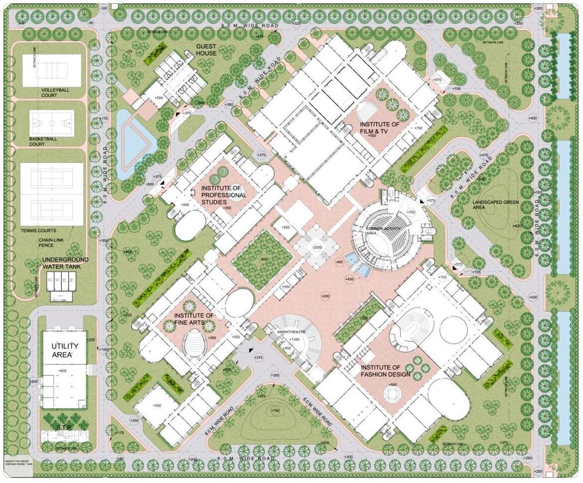 DRAWINGS AND SITE IMAGES RESPONSIBILITY –• As built Drawing, Completion Documents . • Detailing out of PV Cells Installation. • False ceiling design. • Finishing, External Development & Furniture Detailing & Execution. COMMONACTIVITY AREA: SECTION INSTITUTE OF FASHION DESIGN GROUND FLOOR PLAN VISION : ✓ A high technology Institutes which incorporates the essence of traditional values of building design ✓ An Institutional Campus comprising of (a) State Institute of Design and Fashion Technology, (b) State Institute of Fine Arts, (c) State Institute of Film and TV (d) State Institute of Professional Studies SITE PLAN 1 SITE AREA 22.48 ACRES 2 F.A.R. 47242.74 SQM or 52% 3 GROUND COVERAGE 19,183 SQM COFFER SLAB FOR LARGE SPAN AREAS TO ENABLE COLUMN FREE SRUCTURE ATYPICAL COURTYARD PLANNING EMPHASIZING VERNACULAR TRADITIONAL VALUES IN FACADE TREATMENT