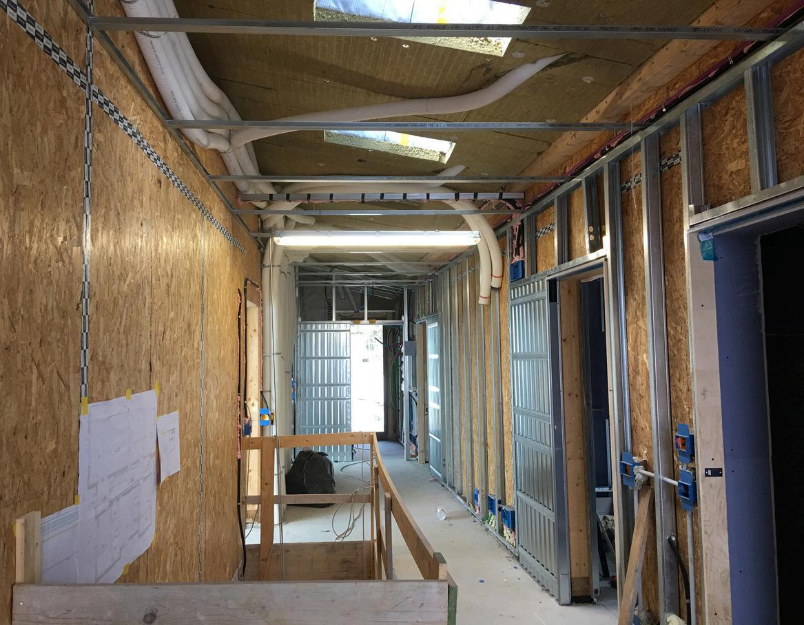 Si è scelto di utilizzare una struttura a secco in acciaio con pannellature in aquapanel (Knauff) in modo da accorciare i tempi di lavorazione e da non gravare in nessun modo sulla struttura esistente che non garantiva l'appoggio alla nuova realizzazione L'ossatura principale è composta da pilastri in cemento armato collegati con travi reticolari in acciaio composte da tiranti e puntoni, mentre le pareti di tamponamento esterne e interne sono composte da pannelli in aquapanel della Knauff correttamente isolate sia termicamente che acusticamente, raggiungendo alti livelli di comfort e creando in tutto e per tutto una nuova struttura completamente indipendente, sotto ogni punto di vista, dall'esistente