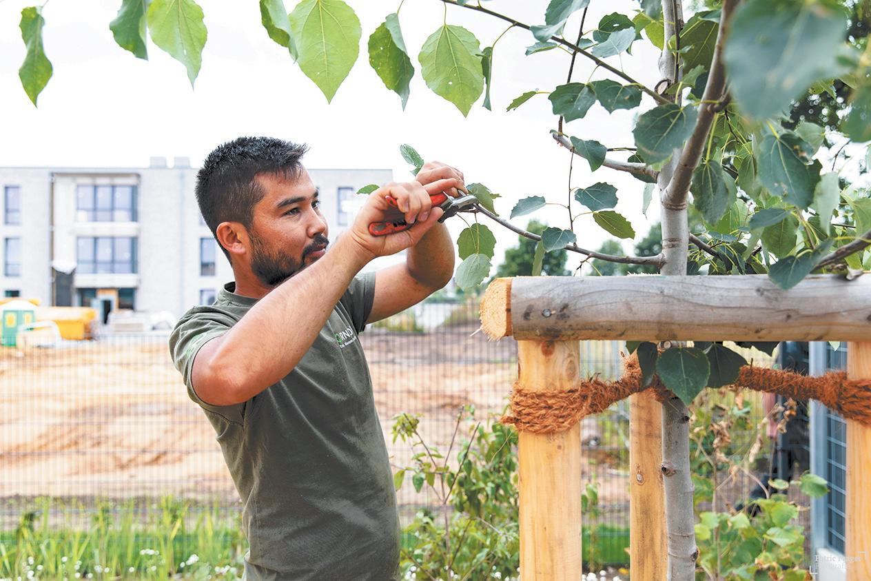 Vor der Ausbildung hat er ein Praktikum gemacht, um den Beruf des Landschaftsgärtners besser kennenzulernen. Er erzählt: „Es war erst schwer, wenn man aus einem anderen Land kommt, aber der Chef und die Kolleg*innen haben mir geholfen. Sie haben viel erklärt und gesagt: ‚Du musst keine Angst haben‘.“