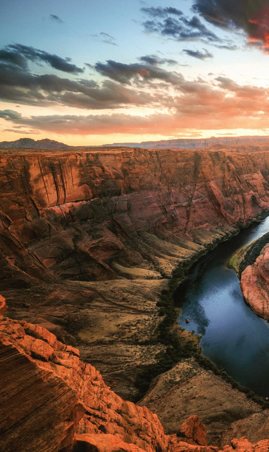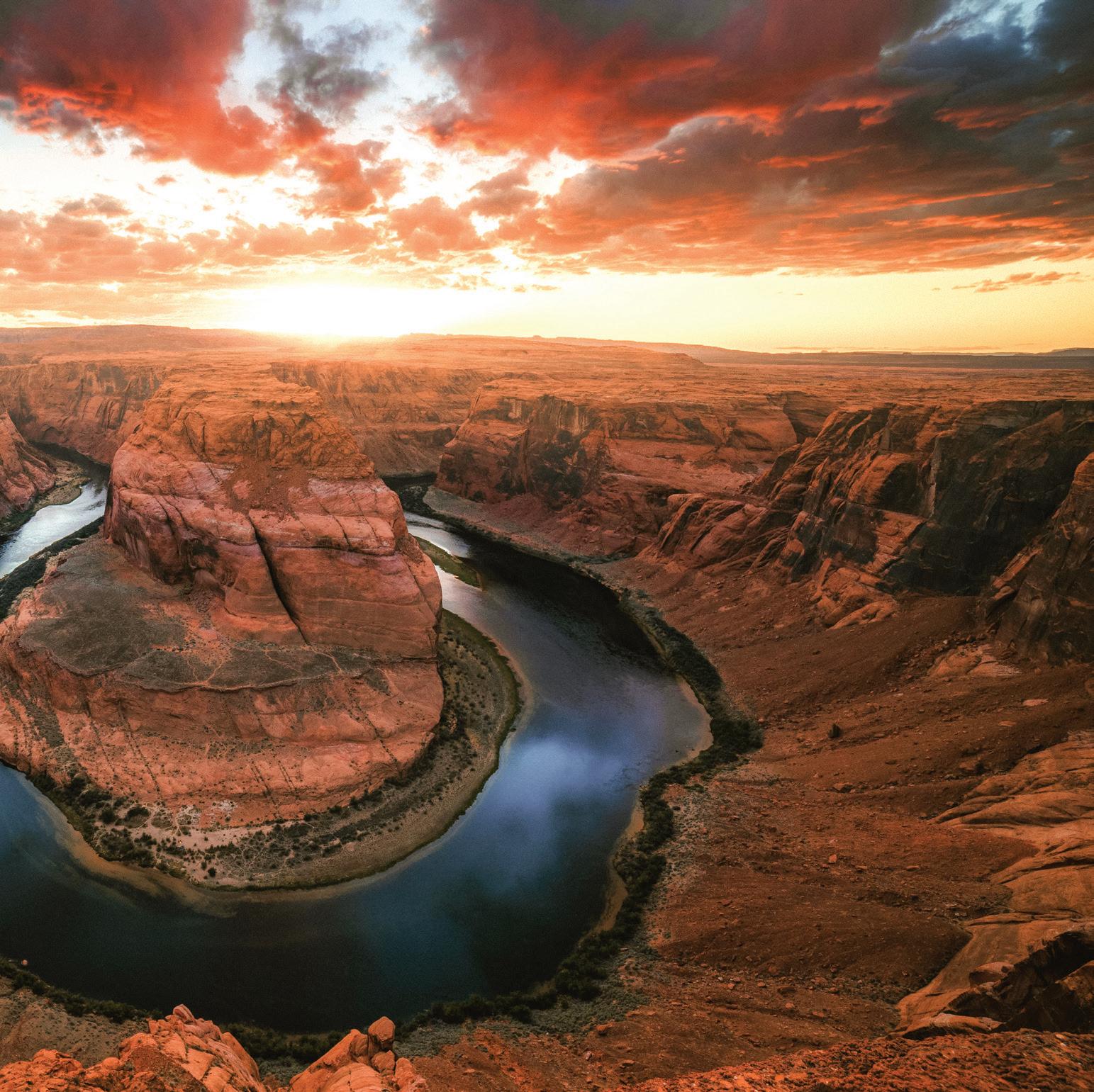 Located in Glen Canyon National Recreation Area, just nine miles downstream from where Grand Canyon National Park begins, is Horseshoe Bend. Here, the Colorado River makes its stunning horseshoe-shaped turn. An overlook approximately 1,000 feet above provides a jaw-dropping view of the locale. https://horseshoebend.co