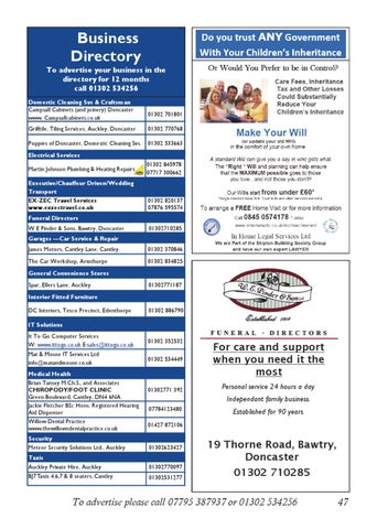 Medical Health Brian Tansey M.Ch.S., and Associates CHIROPODY/FOOT CLINIC Green Boulevard, Cantley, DN4 6NA Jackie Fletcher BSc Hons. Registered Hearing Aid Dispenser Willow Dental Practice www.thewillowsdentalpractice.co.uk Security Meteor Security Solutions Ltd., Auckley