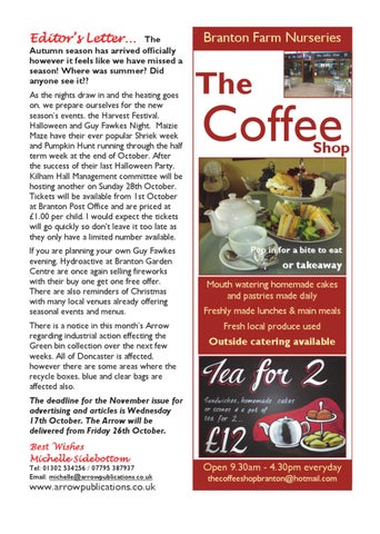 The Autumn season has arrived officially however it feels like we have missed a season! Where was summer? Did anyone see it?? As the nights draw in and the heating goes on, we prepare ourselves for the new season’s events, the Harvest Festival, Halloween and Guy Fawkes Night. Maizie Maze have their ever popular Shriek week and Pumpkin Hunt running through the half term week at the end of October. After the success of their last Halloween Party, Kilham Hall Management committee will be hosting another on Sunday 28th October. Tickets will be available from 1st October at Branton Post Office and are priced at £1.00 per child. I would expect the tickets will go quickly so don't leave it too late as they only have a limited number available. If you are planning your own Guy Fawkes evening, Hydroactive at Branton Garden Centre are once again selling fireworks with their buy one get one free offer. There are also reminders of Christmas with many local venues already offering seasonal events and menus. There is a notice in this month’s Arrow regarding industrial action effecting the Green bin collection over the next few weeks. All of Doncaster is affected, however there are some areas where the recycle boxes, blue and clear bags are affected also.