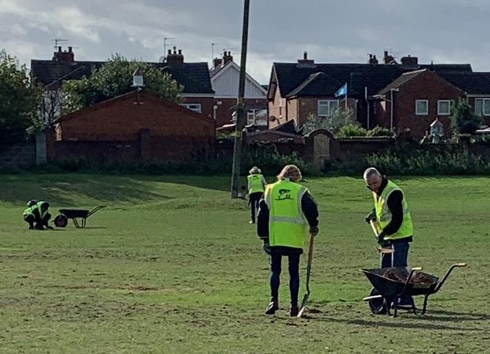 Our October work party took place on Friday 7th and we had a record turnout of volunteers! There were 18 of us in total, including 4 new recruits and 2 DMBC Rangers. We split into two groups, one of which went around the park litter picking. They did a great job and collected 6 bags of rubbish. The rest of the team set about filling in some of the many rabbit holes in the central grassed area. A huge thank you to Dunsville Quarry for donating the sand, and to Paul for collecting it in his trailer. Riley the dog thought it was a good game digging the sand out of the newly filled holes! We had a break for refreshments and enjoyed buns baked by Debra before continuing with our tasks. It was a great morning’s work and we managed to beat the rain! Thank you to everyone who joined us.